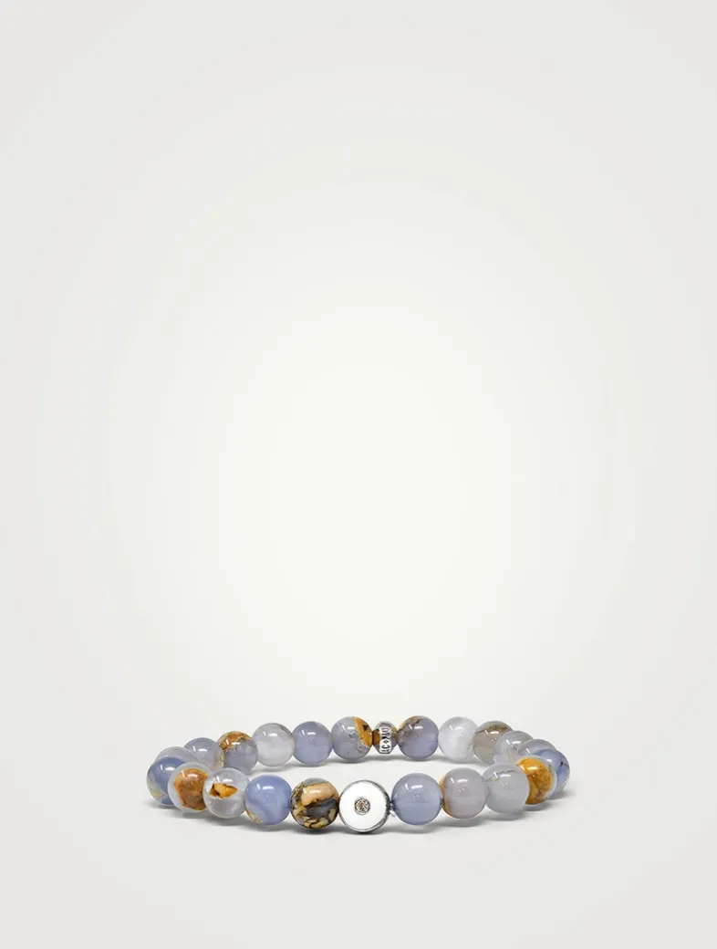 Chalcedony beads are fastened with a sterling silver enamel charm, set with clear topaz. The beads, which encourage balance of the mind, body and spirit, are strung on a stretch cord for ease of wear.