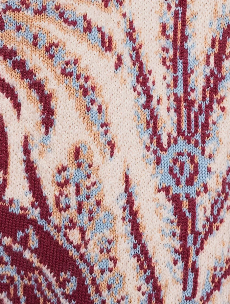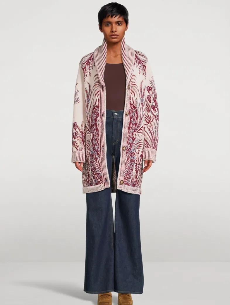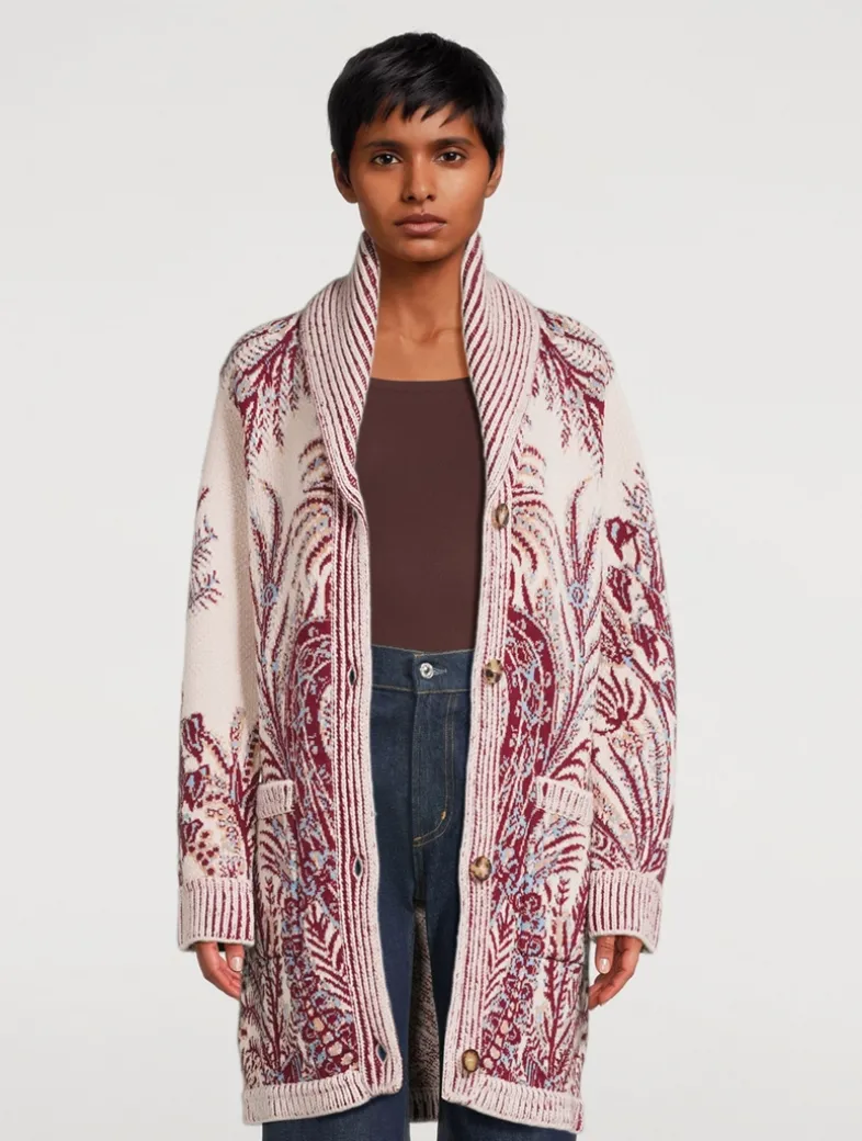 This maxi cardigan is knit in a cotton and wool-blend jacquard embellished with refined floral Paisley motif. This model also features a shawl lapel collar and two large front pockets. The ribbed detailing completes the design.