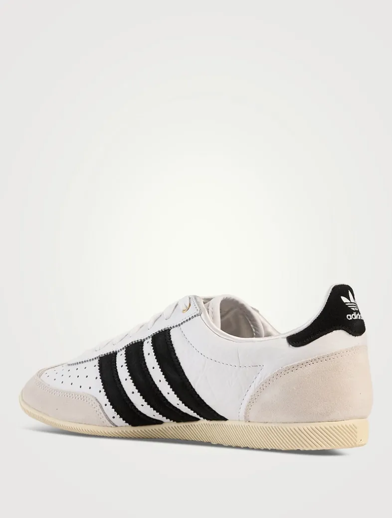 Originally designed for training for championship athletes, the simple yet striking design of the adidas Japan has been revived for the streetwear scene. A tumbled leather upper has a soft, supple feel, while perforations provide breathability. The leather is double-stitched at the toe and heel counter for added durability and support, and the textured EVA midsole provides stability and support. Serrated 3-Stripes and lace overlays and metallic branding show off iconic details from these heritage classics pulled from the archive.