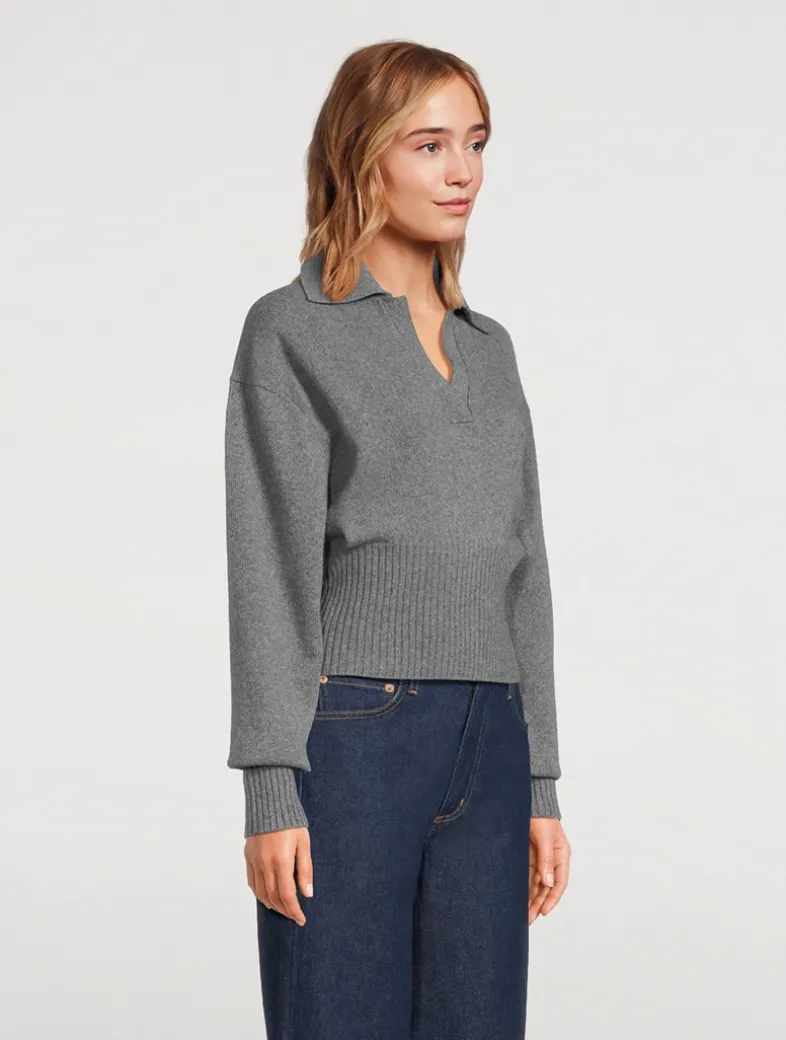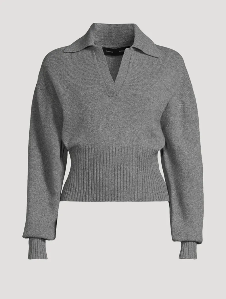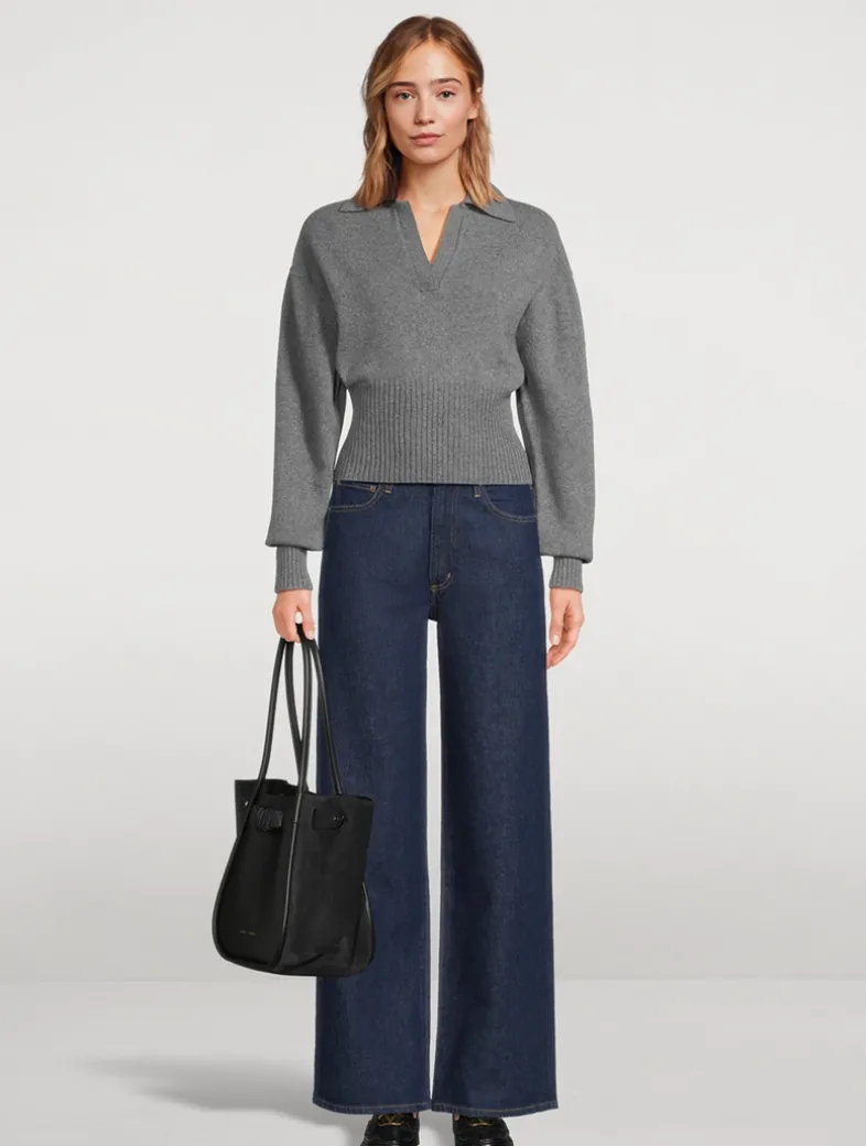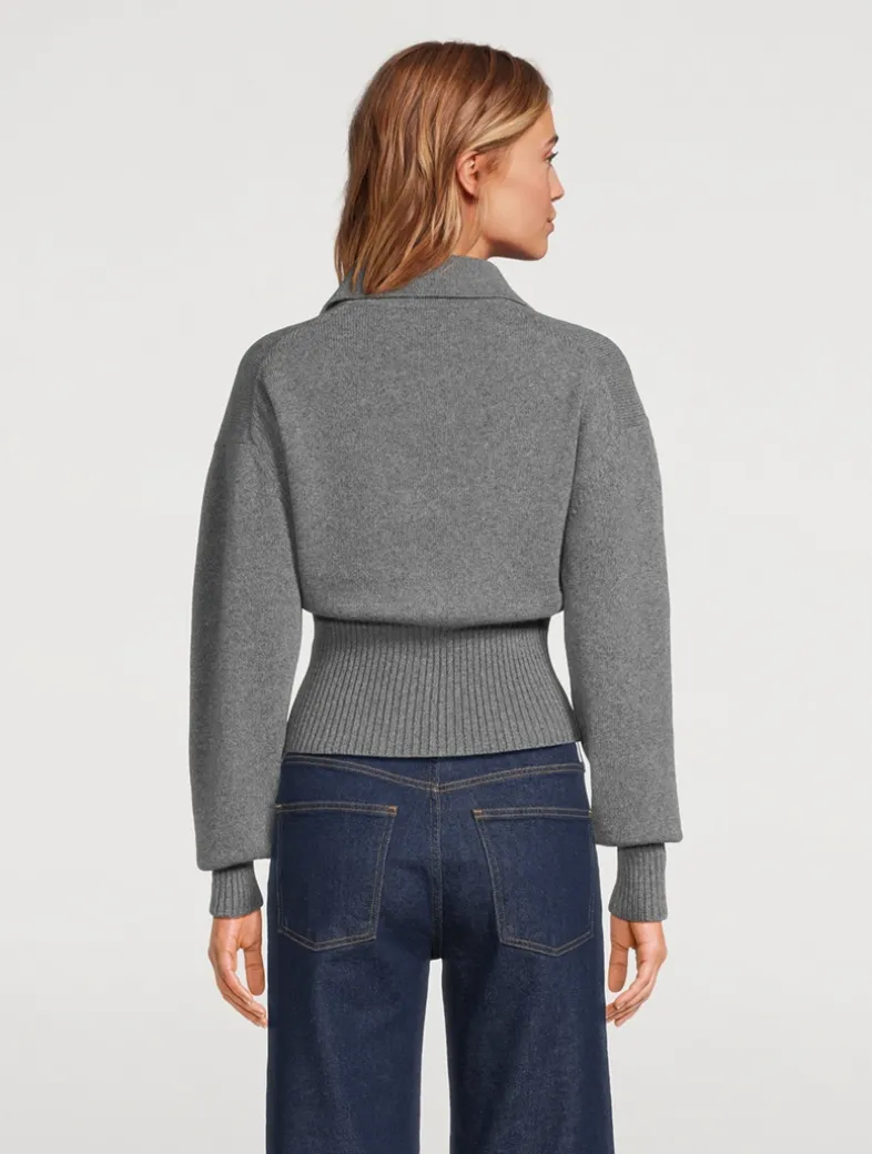 The Jeanne is spun from a mix of plush cashmere and wool yarn for a soft hand feel. Featuring a spread collar, long balloon sleeves, and a sculpted ribbed-knit waistband.