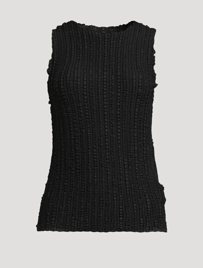 This roundneck, sleeveless top gives a fresh impression with its random pleat lines. After adding box pleats, a Majolica pleating process was applied, resulting in new pleat lines unlike any other. Despite being 100% polyester, the base fabric has a cotton-like texture and gives a different impression from the standard pleated tops. Please note: The size of this product may vary slightly from item to item.