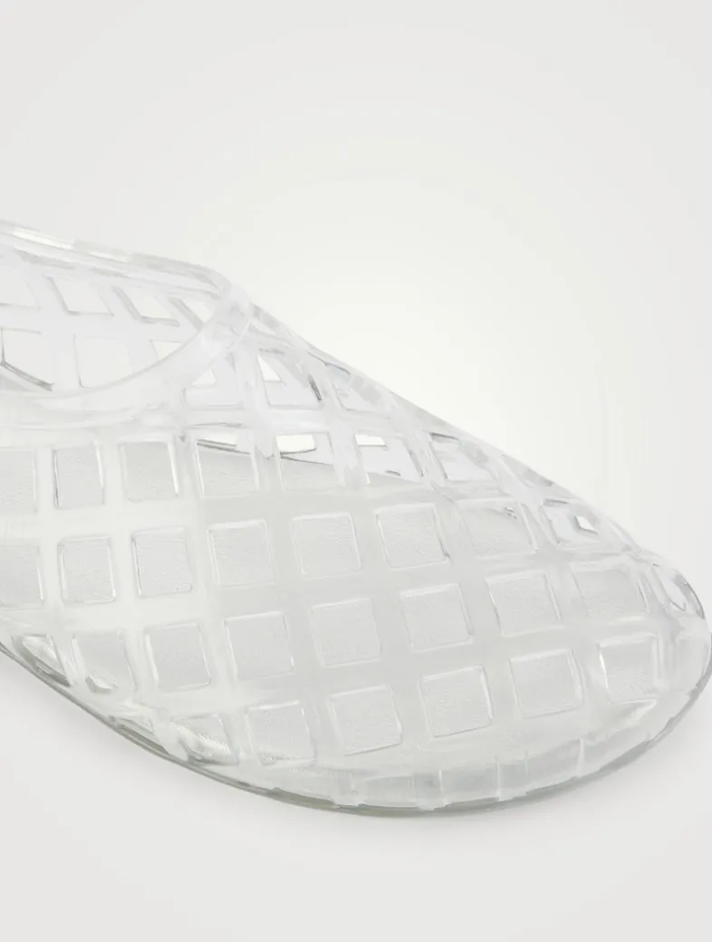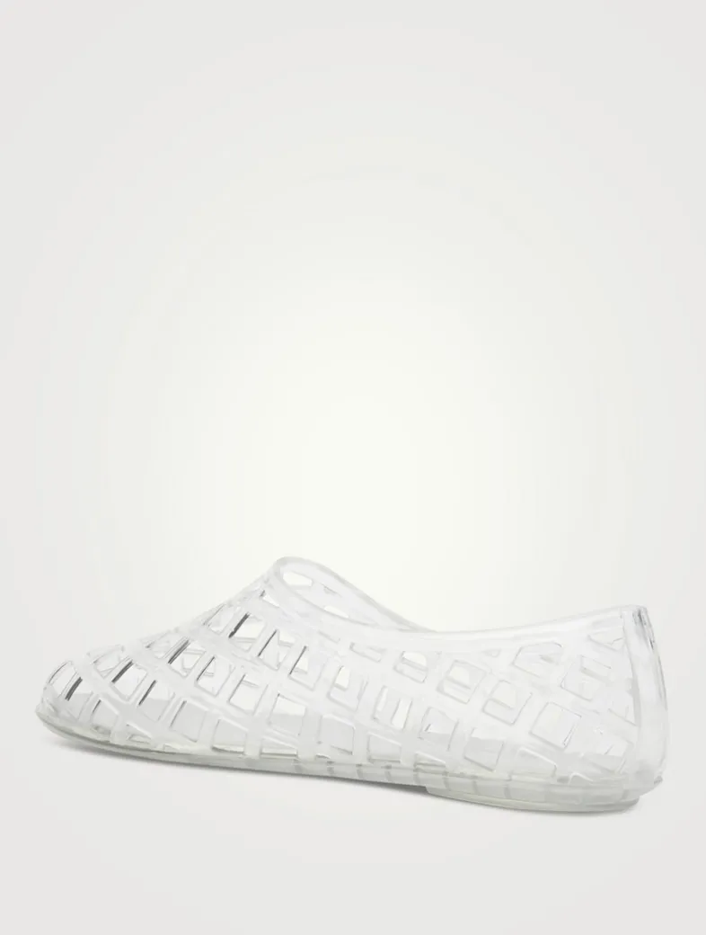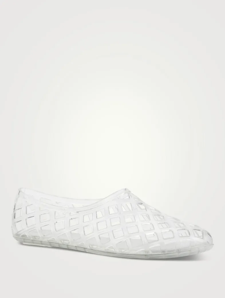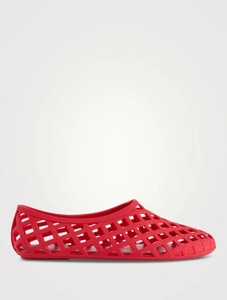 These round-toe flats are crafted from slim strips of soft rubber in a cage-style pattern.