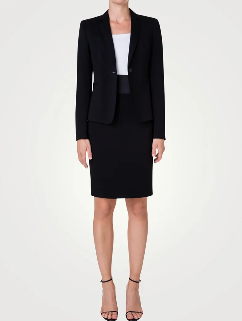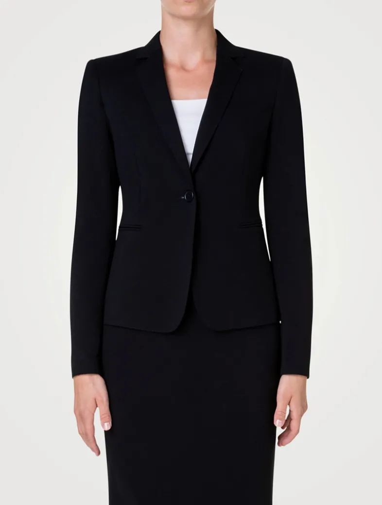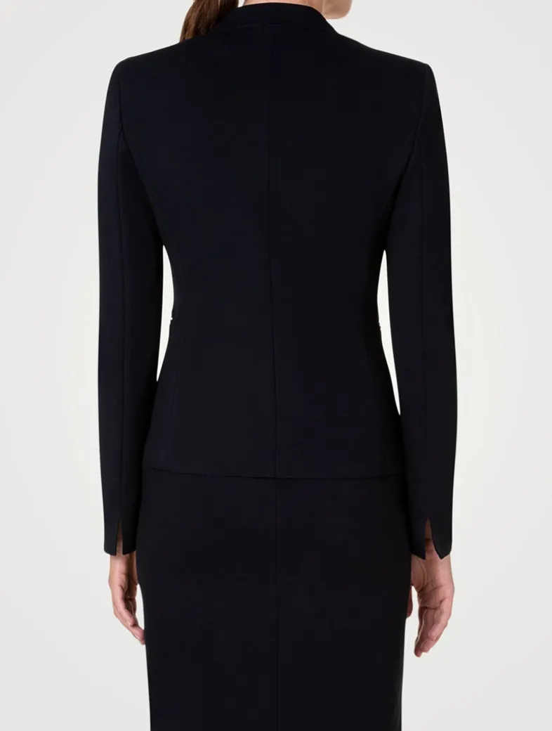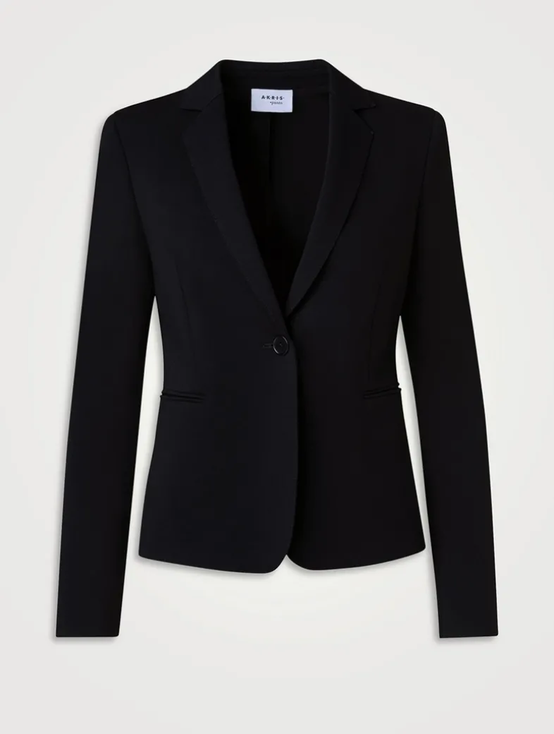 Techno grid-stretch jersey blazer with one button closure, split cuffs, and welt pockets at the waist.