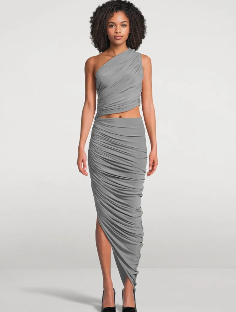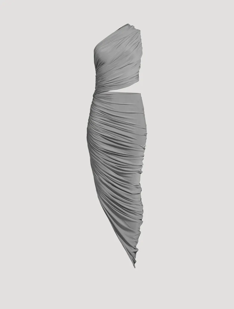 Asymmetric detailing lends a modern touch to this easy jersey dress. Flaunting a draped design, it has a one-shoulder neckline, a slim cut-out at the waist, and a high-low hem that finishes at the ankle.
