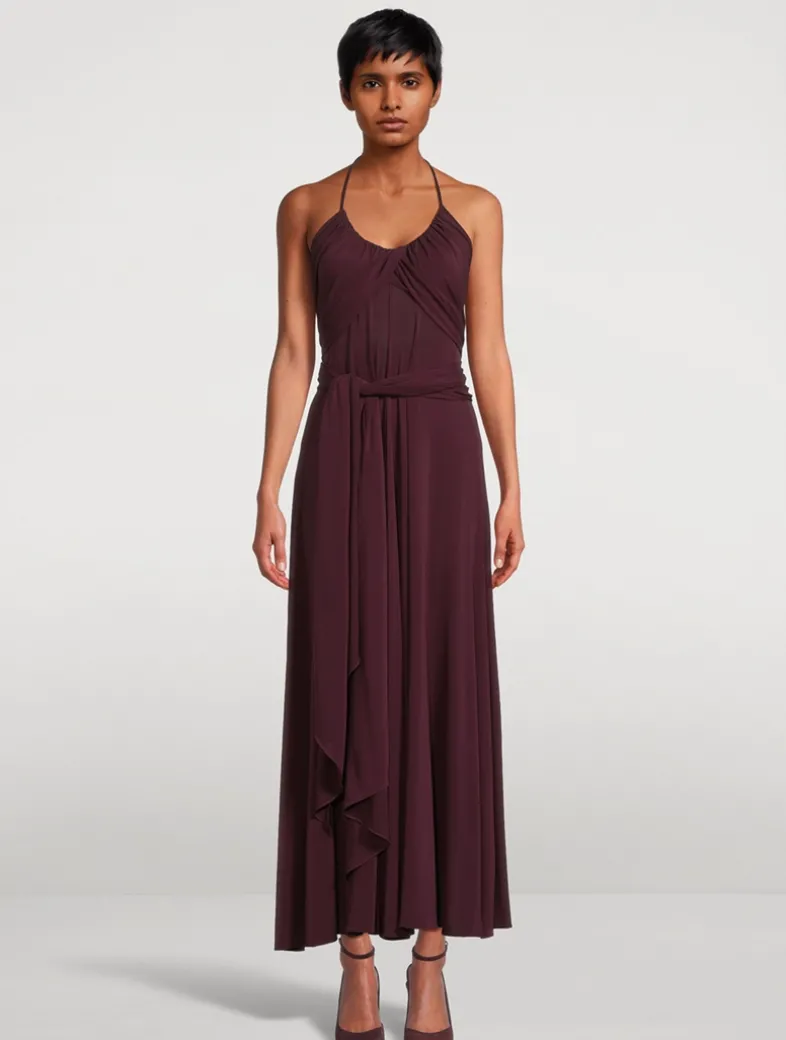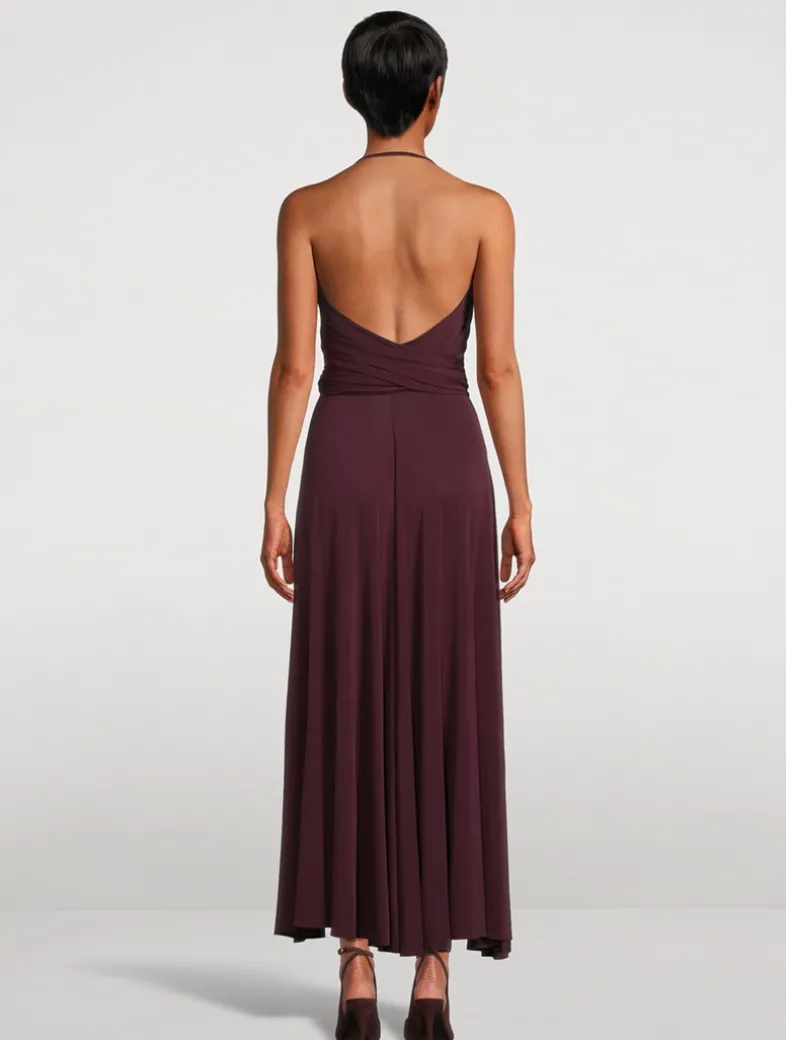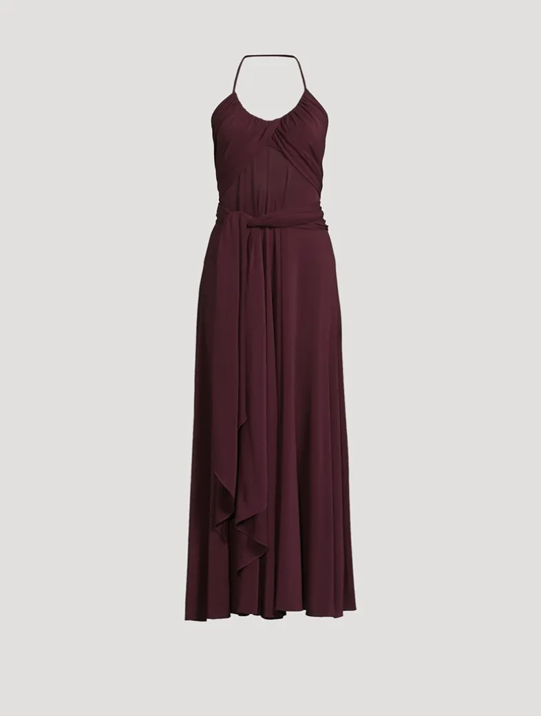 The bodice of this open-back halter dress has soft draping and crossed detailing in a fluid jersey fabrication. It is paired with a sweeping ankle-length skirt.