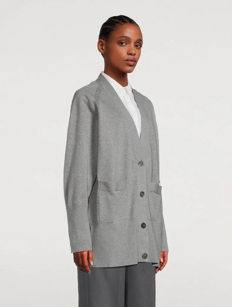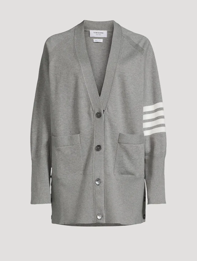 Made in Italy, this V-neck cardigan is designed with dropped shoulders and contrasting 4-bar stripe detail at the sleeve. Crafted in cotton, it is finished with a striped grosgrain placket, buttoned sides and cuffs with a striped trim, and signature striped grosgrain loop tab at the back neck.