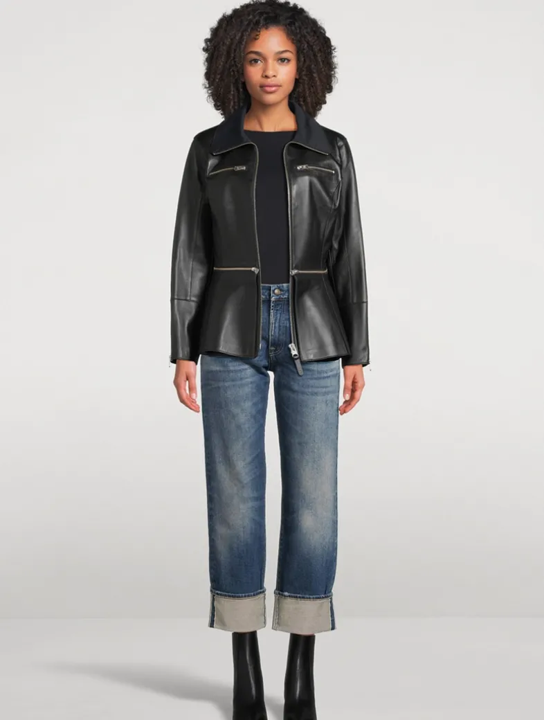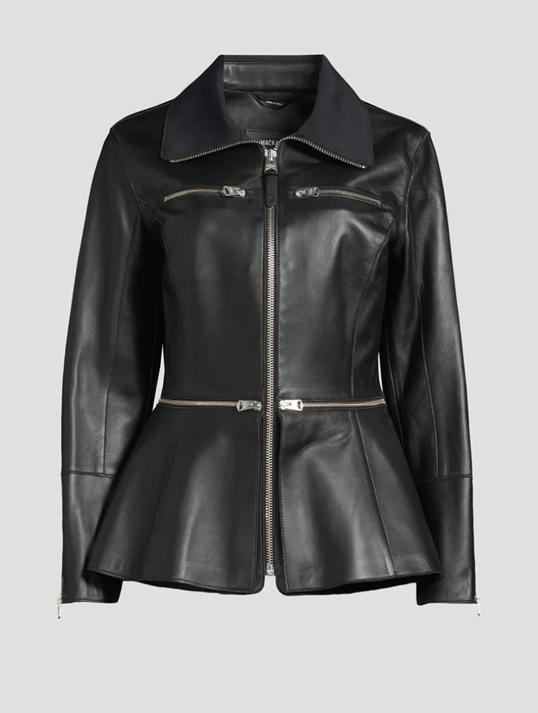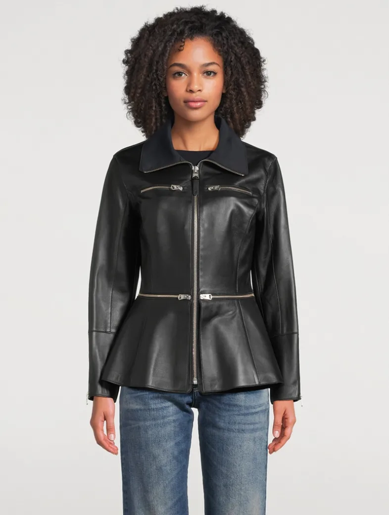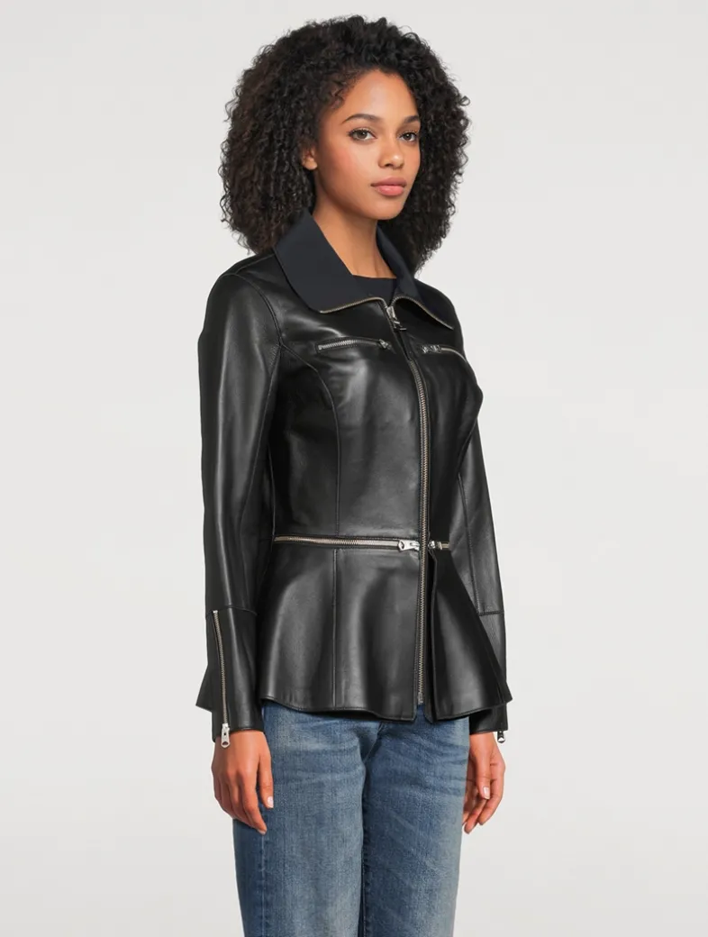 A buttery-soft leather construction defines this topper. Exquisitely tailored to a nipped-in silhouette, it has zippers at the waist and a flared peplum hem.