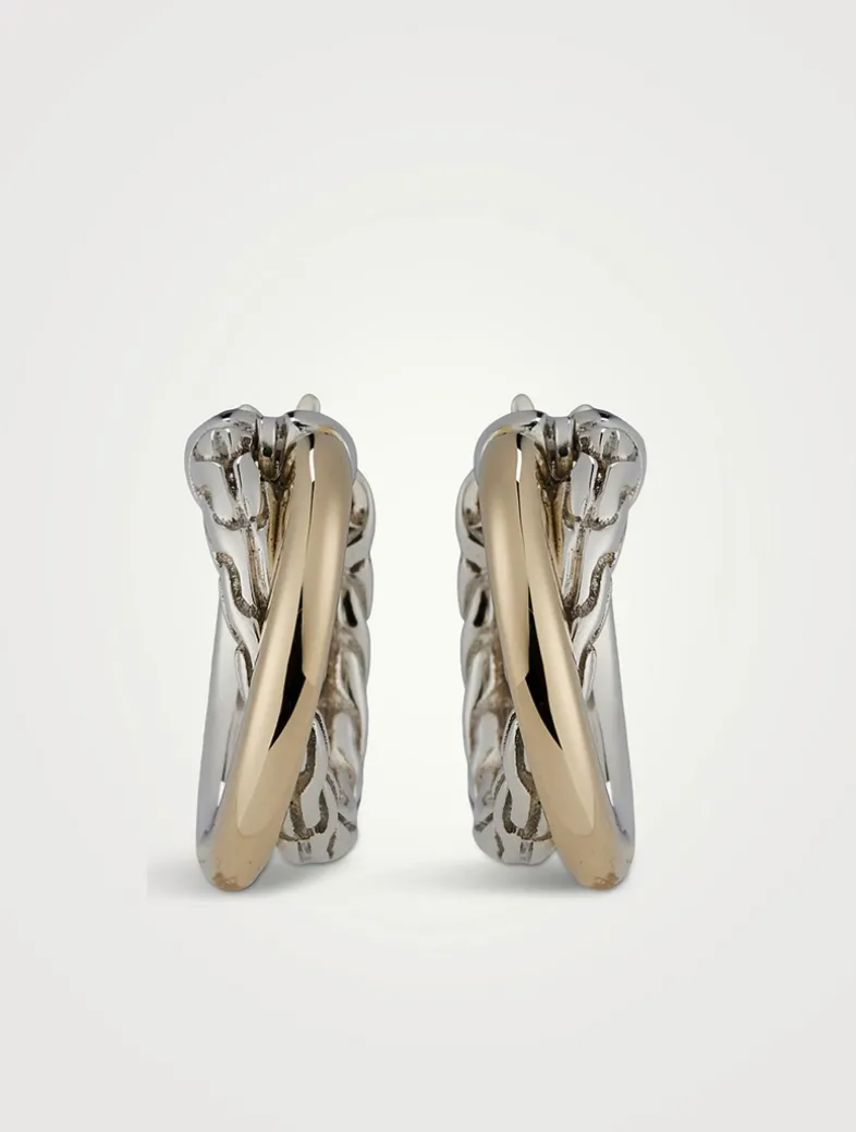 Artisan handcrafted, these crossover hoop earrings in 100% reclaimed gold and sterling silver feature John Hardy’s signature carved chain texture.