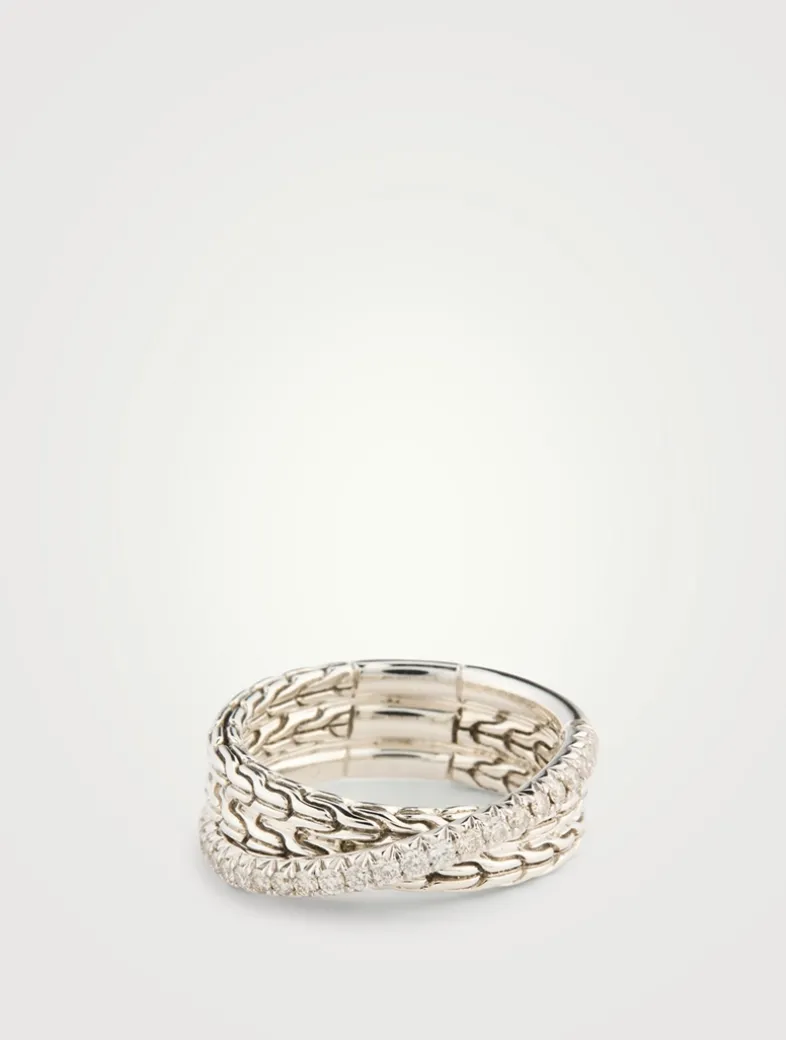 Artisan handcrafted, this crossover ring in sterling silver features the brand’s signature carved chain motif and brilliant pavé diamonds.