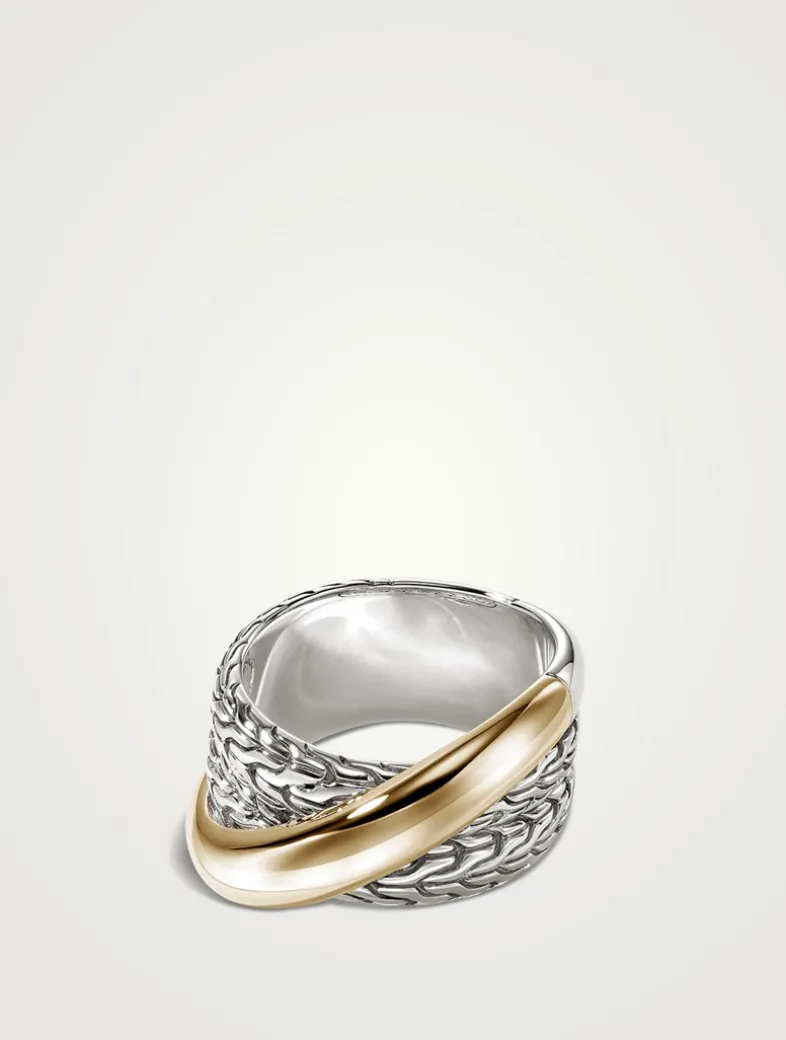 A crossover band ring in reclaimed gold and sterling silver, featuring John Hardy’s signature carved chain texture offset by high-shine gold. Artisan handcrafted.
