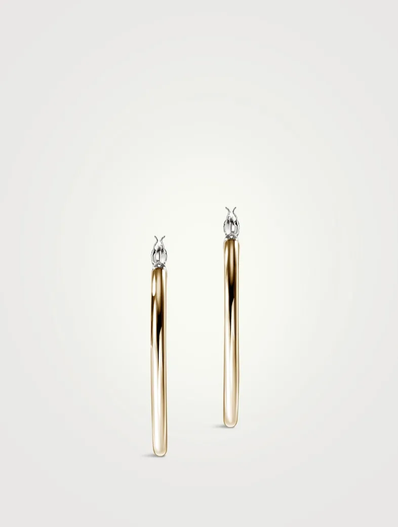 A set of hoop earrings in reclaimed gold and sterling silver, featuring John Hardy’s signature carved chain texture offset by high-shine gold. Artisan handcrafted.