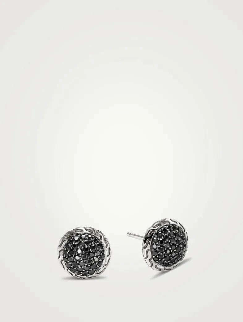 These pavé stud earrings feature John Hardy’s signature carved chain motif in reclaimed sterling silver and ethically sourced black sapphires. Artisan handcrafted.