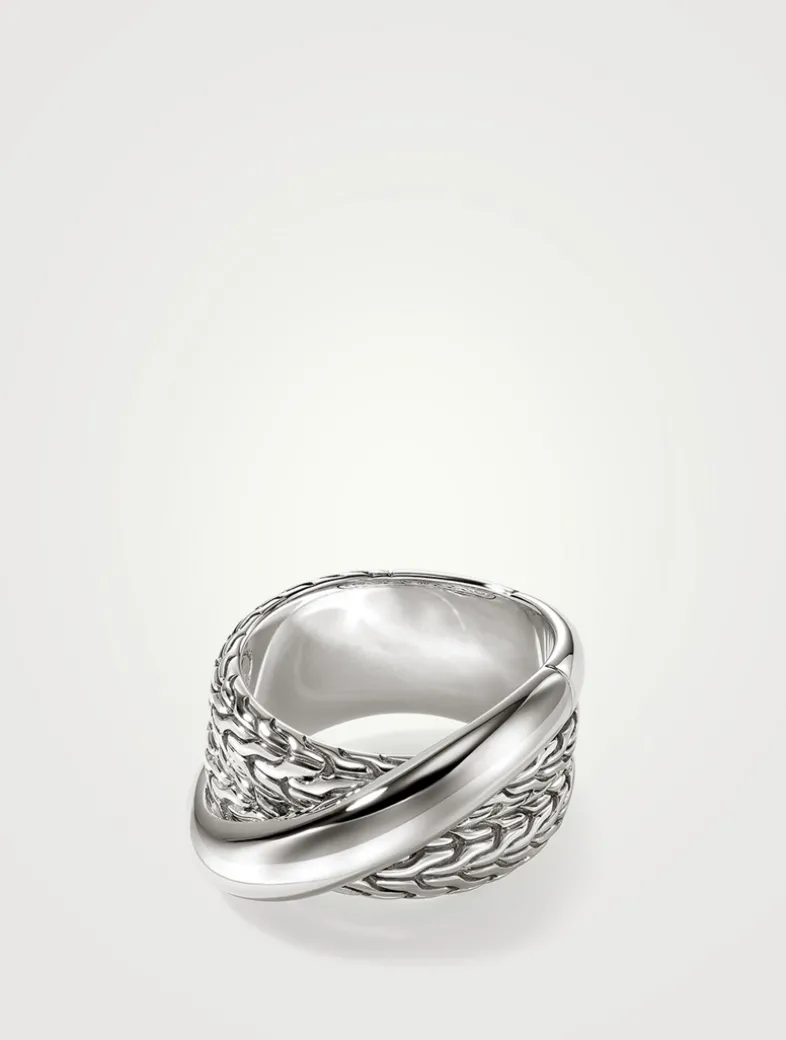A crossover band ring in reclaimed sterling silver, featuring John Hardy’s signature carved chain motif. Artisan handcrafted.