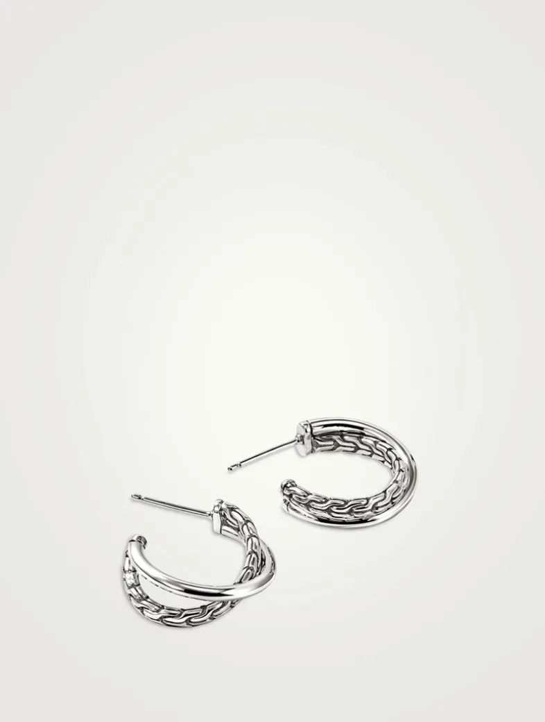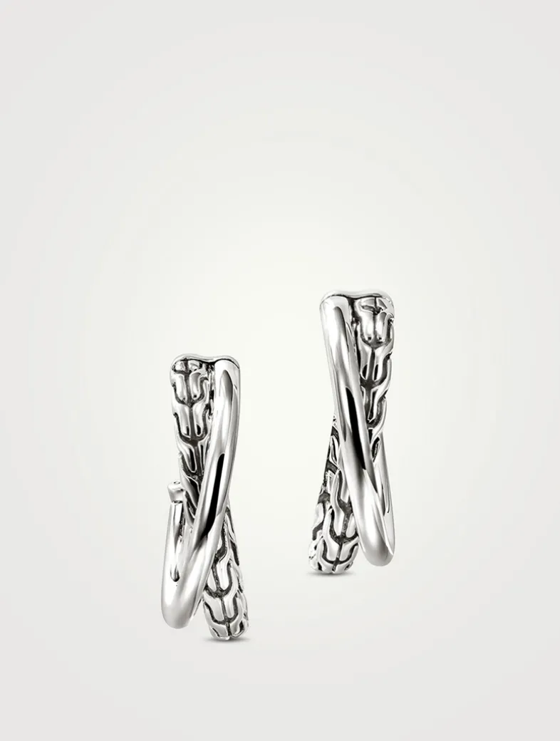 Artisan handcrafted, this pair of crossover hoop earrings in sterling silver features a signature carved chain motif.
