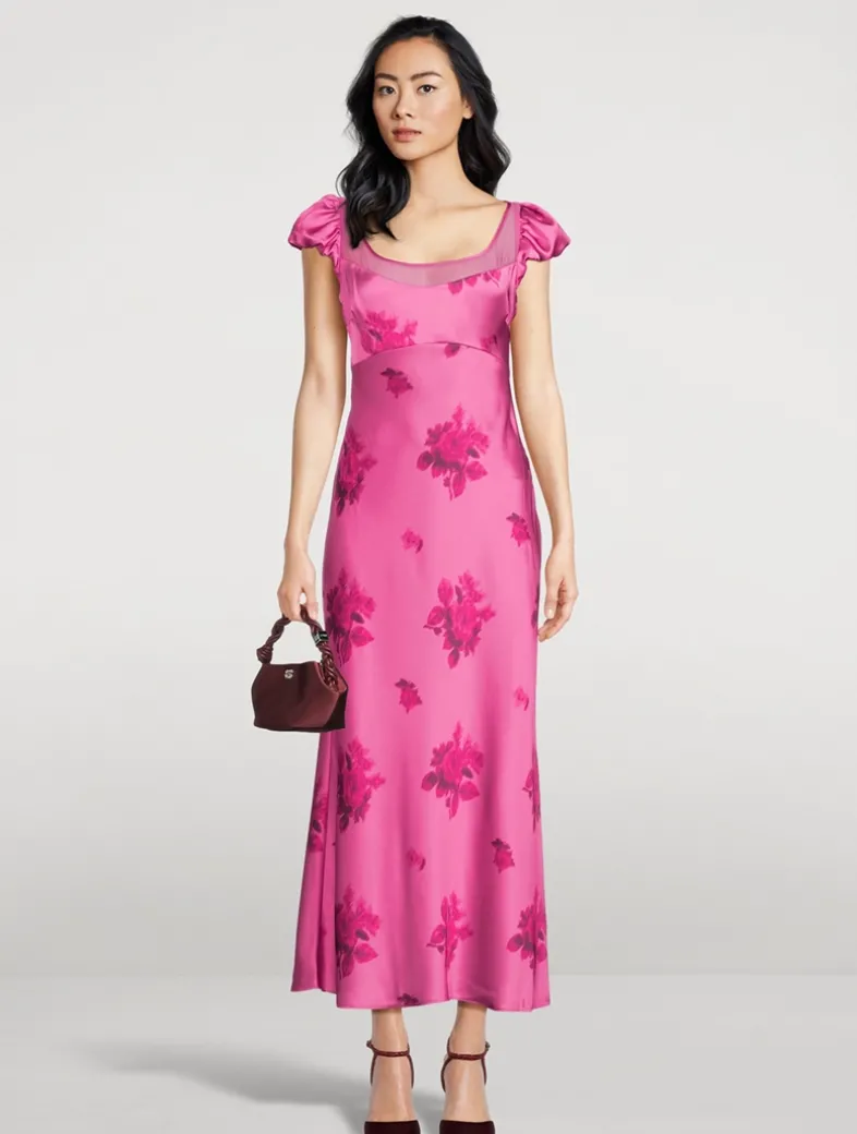 Cut on the bias, this curve-skimming dress is crafted from a fluid satin printed with a lovely floral motif. Flaunting an empire waist, it is framed by ruched cap sleeves and finished with semi-sheer mesh at the bust.