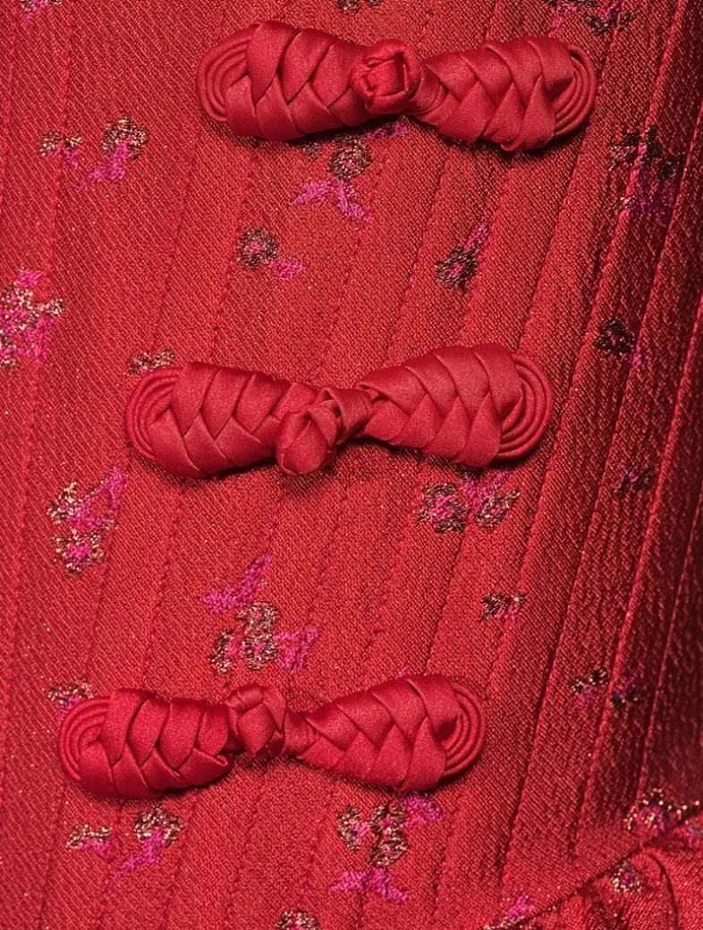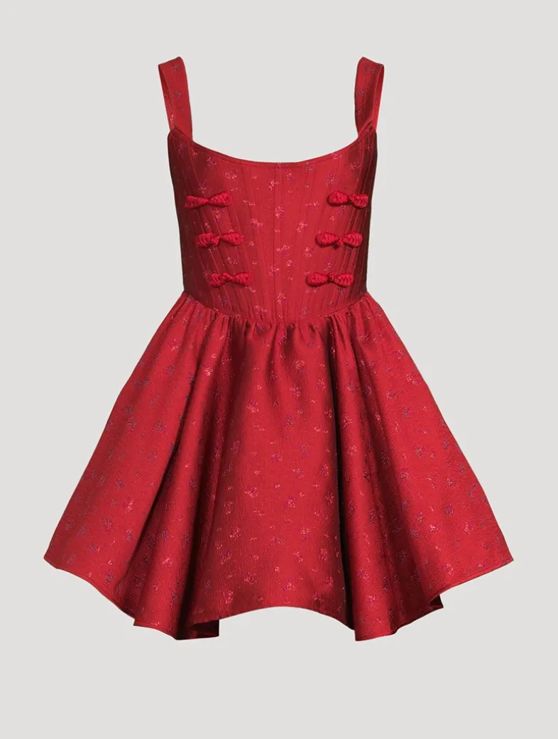 Nodding to babydoll styles, this jacquard mini dress is designed with a fully-boned corset and a flared skirt with pockets. This festive piece is further elevated with SAU LEE’s signature hand-tied pipa knot button detail.