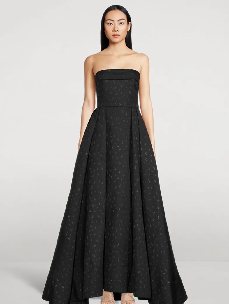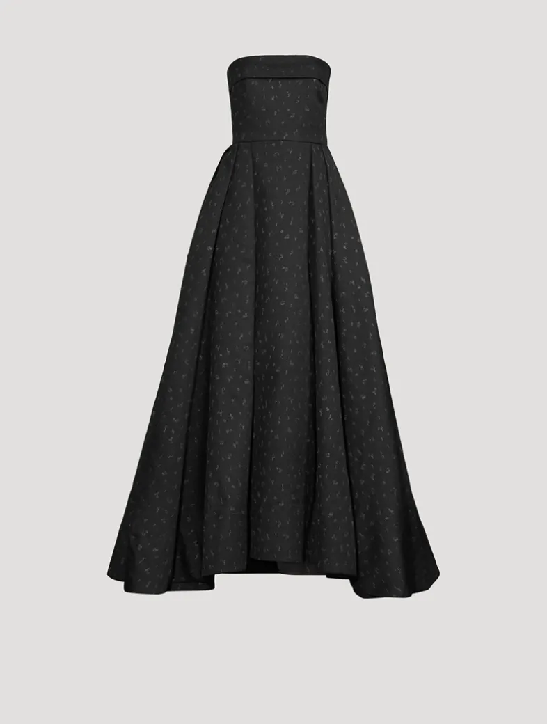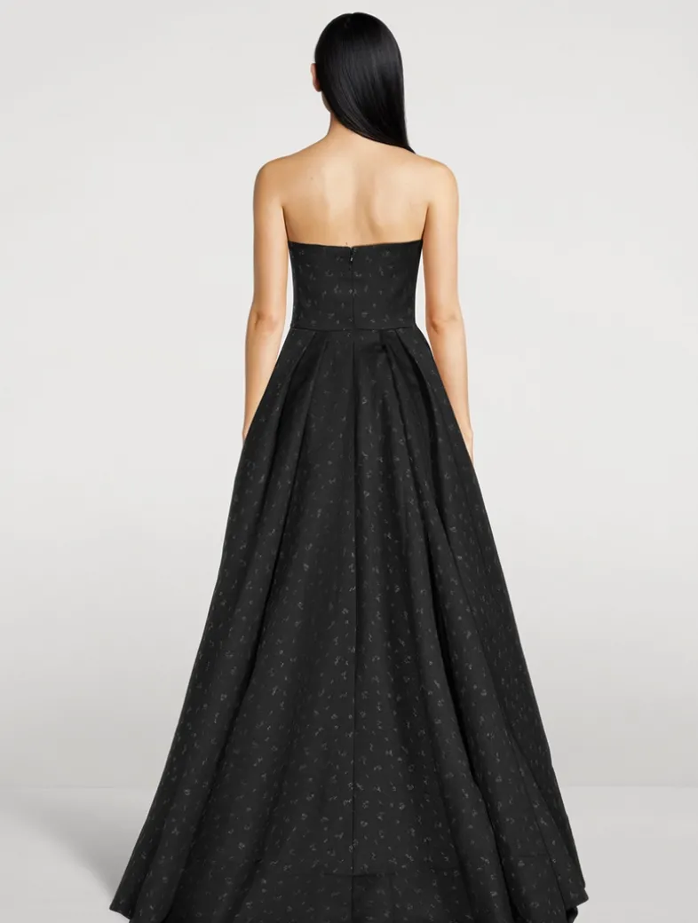 A timeless evening style, this sweeping jacquard gown is designed with a fully-boned strapless corset and high-low silhouette featuring pockets on the sides.