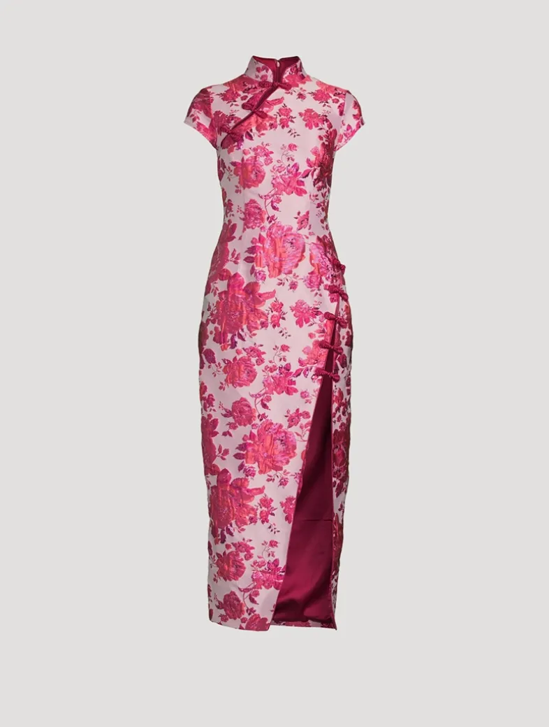 Modern cheongsam jacquard midi dress with a high collar and cap sleeves featuring the brand’s signature hand-tied pipa knot detail. It has an asymmetric slash at the neckline and a cut-up-to-there side slit to reveal a hint of skin.