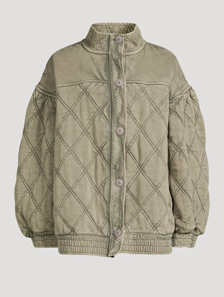 Effortless and oversized, this too-cool bomber jacket features extra wide sleeves with quilting throughout and shirred trim. Featuring a comfy cotton fabrication, dropped shoulders, and a zipper closure with button placket.