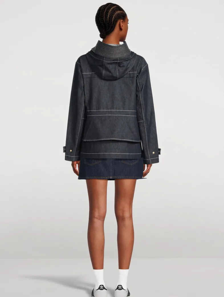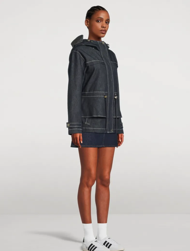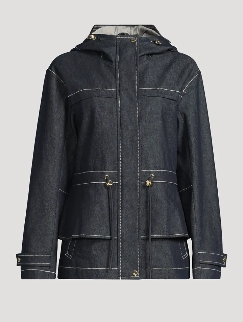 Kaori is a semi-fitted twill jacket crafted from organic cotton denim. Featuring an adjustable peplum-style bungee waist, storm visor hood, and rain shedders at the front and back, it balances structured detailing with weather-ready performance. Gold-tone hardware and contrast stitching throughout elevate the look. Fully lined and windproof to take on the seasons in between.