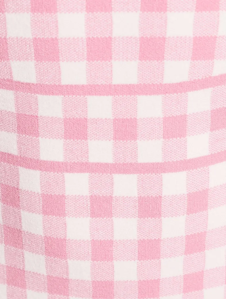 Cut to a curve-hugging silhouette with cap sleeves and a square neckline, this mini dress is printed with a classic gingham motif finished with delicate scallop lace trim.