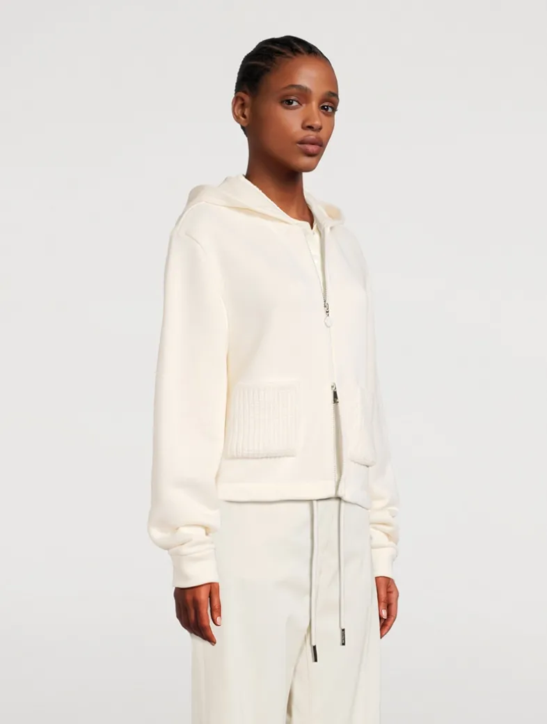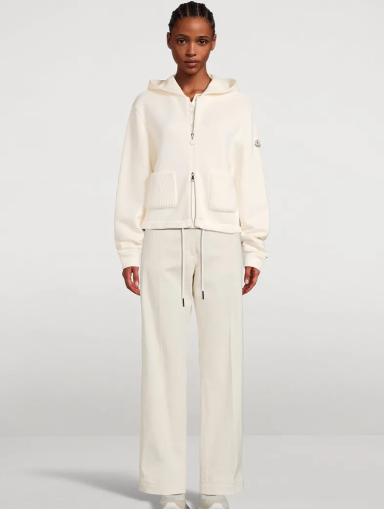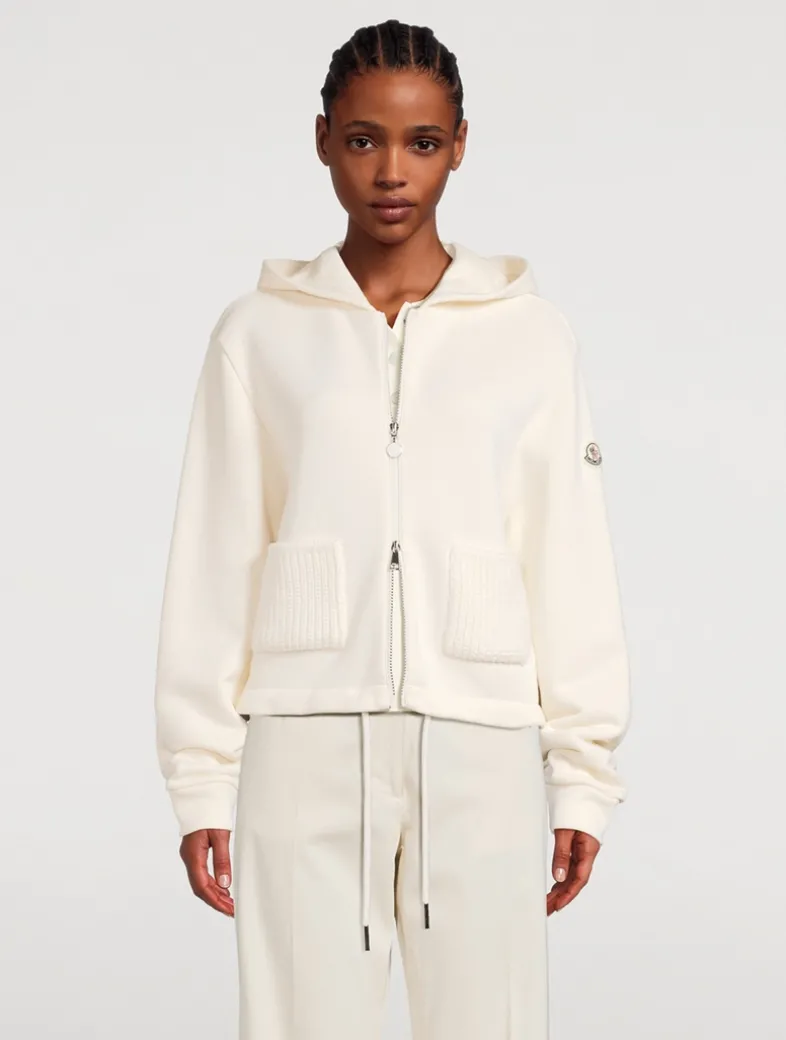 Crafted from the softest cotton fleece, this hooded sweatshirt is elevated through tonal textured knit accents. Cut in a loose fit, this relaxed hoodie is finished with a two-way zip closure, drawstring hem, and Moncler logo patch at the sleeve.