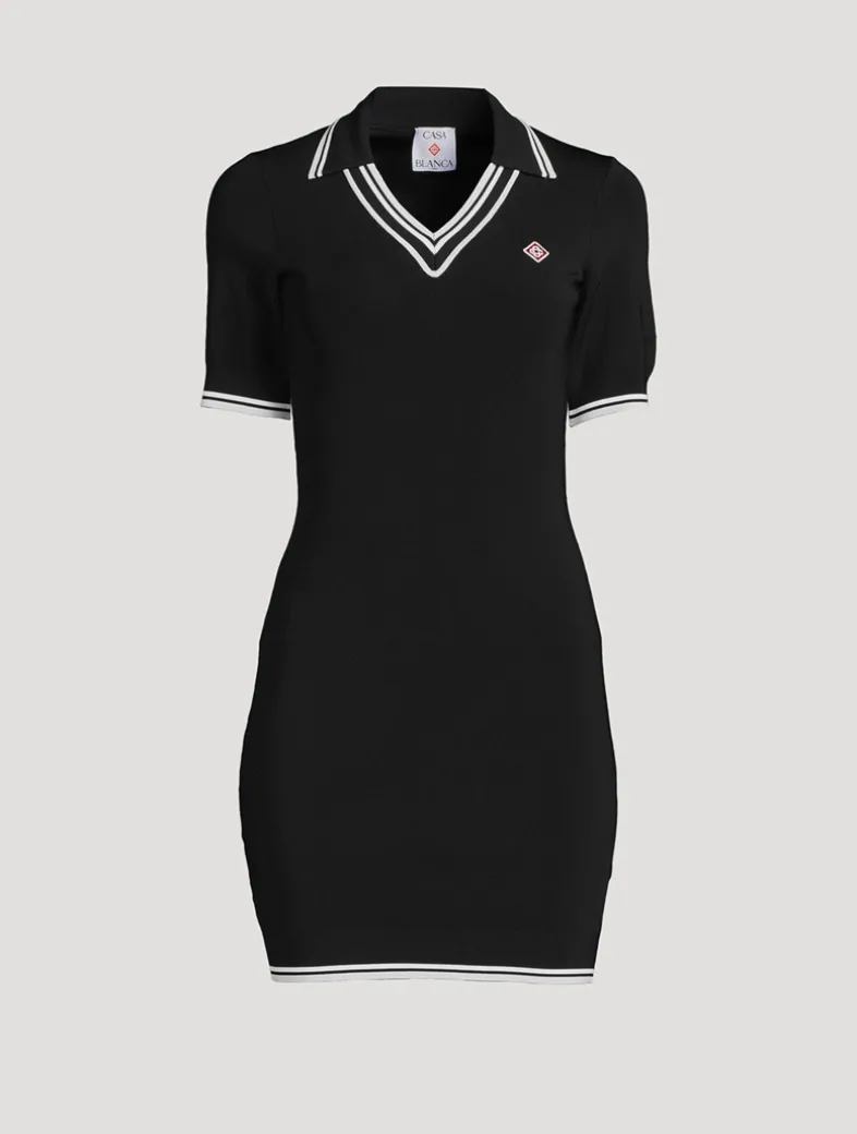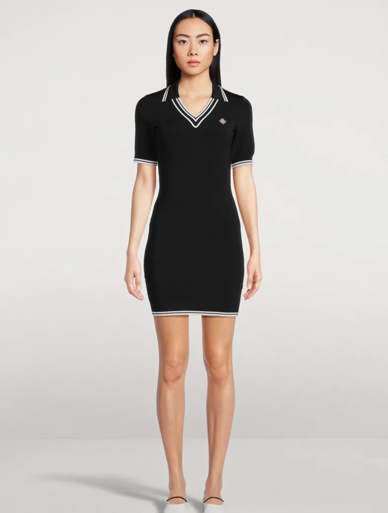 This V-neck polo dress is a short-sleeve design crafted from knit fabric featuring the house’s signature diamond logo. Completed with a ribbed collar and stripe edge detailing on the collar, cuffs, and hem.