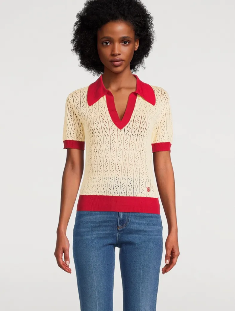 Knit from a linen blend with a pointelle finish, this short-sleeve polo nods to vintage-inspired styles. It is edged with contrasting trim and finished with an embroidered logo at the hip.