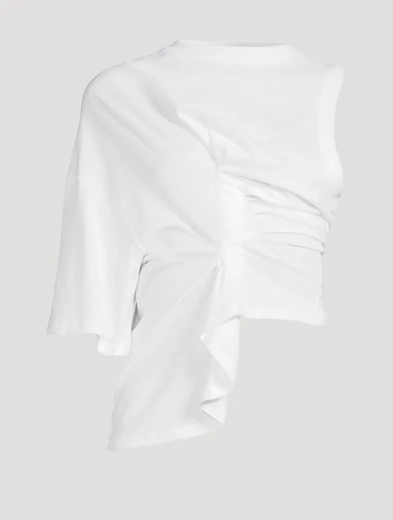 Crafted from GOTS-certified organic cotton, this T-shirt redefines proportions with a crew neckline, an asymmetric one-sleeve silhouette and an asymmetric hem. A batwing sleeve on one side and a twisted knot detail at the front and back create sculptural volume across the chest, while the waist remains closely fitted for contrast.