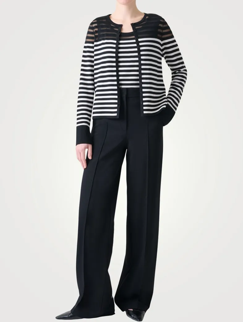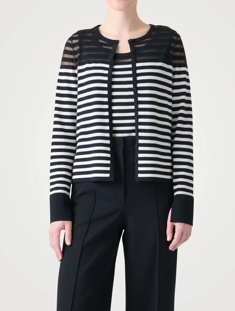 Crafted from a merino wool blend with a hint of stretch, this button-down sweater features kodak stripes and semi-sheer detailing at the shoulders and back.