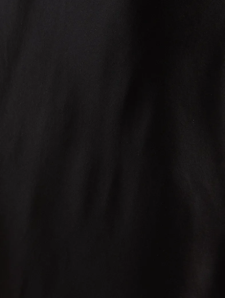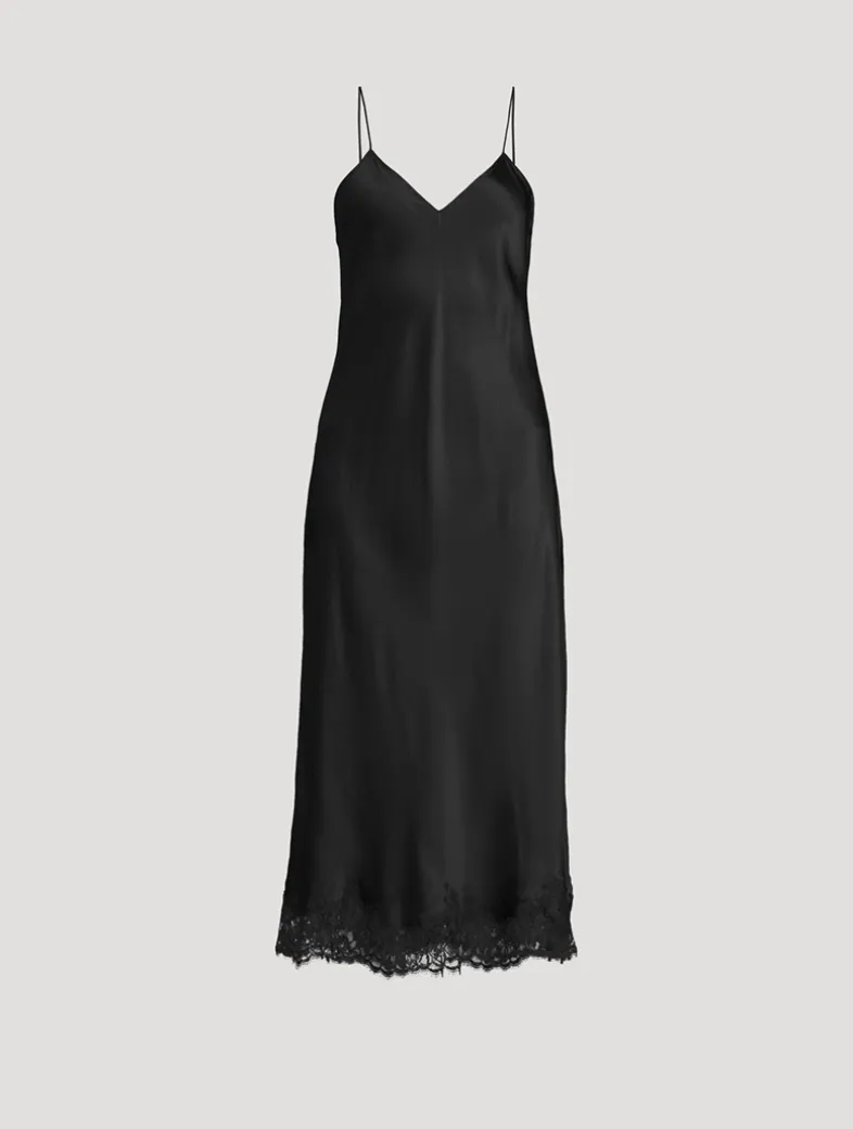 Edged with delicate floral lace at the hem, this slinky silk dress in silk charmeuse is designed with thin spaghetti straps and a curve-skimming fit.