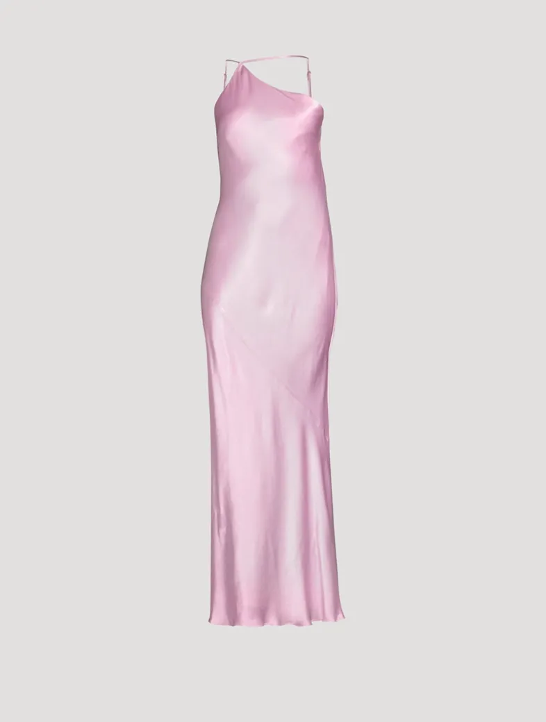This elegant bias-cut dress has an asymmetrical design in LENZING™ ECOVERO™ with luxurious satin finish. It has a one-shoulder neckline framed by adjustable straps and an open back with draped cowl detail.