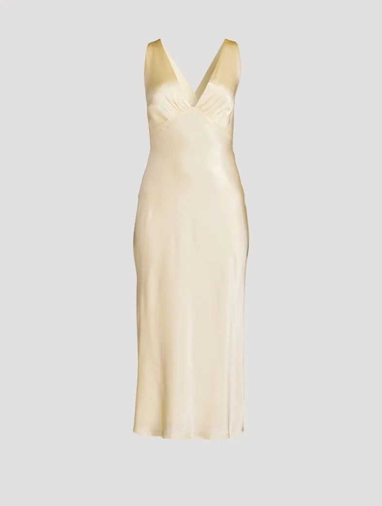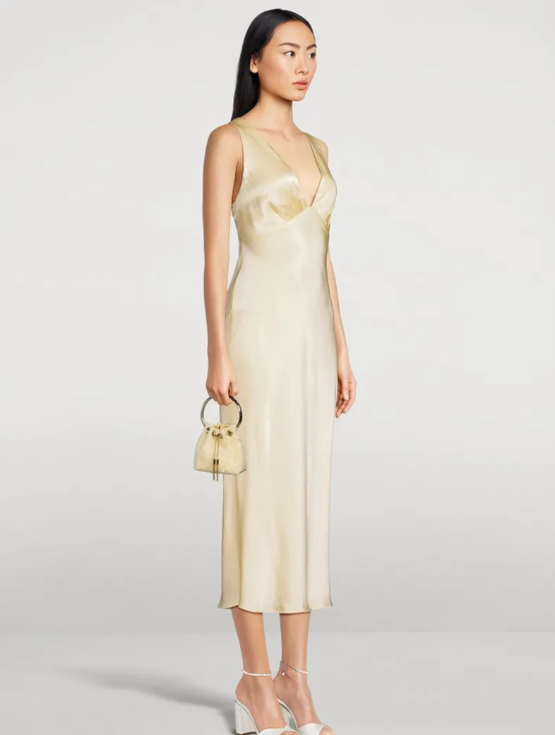 Crafted from a silk-touch fabric, this sleeveless mid-length dress is detailed with a luxurious sheen, and low-plunging neckline with a ruched bust. Cut with an open back with wide crossover straps, it is finished with an exaggerated empire waist and a skirt that is cut on the bias.