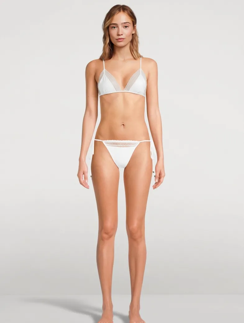 A delicate lace inset is placed into the perfect string bikini tie bottom. Made from Italian swim jersey with stretch French lace trim, these bottoms offer a flattering fit with adjustable ties featuring custom gold-tone KIKIDM stoppers and our signature gold Kiki butterfly at the back.