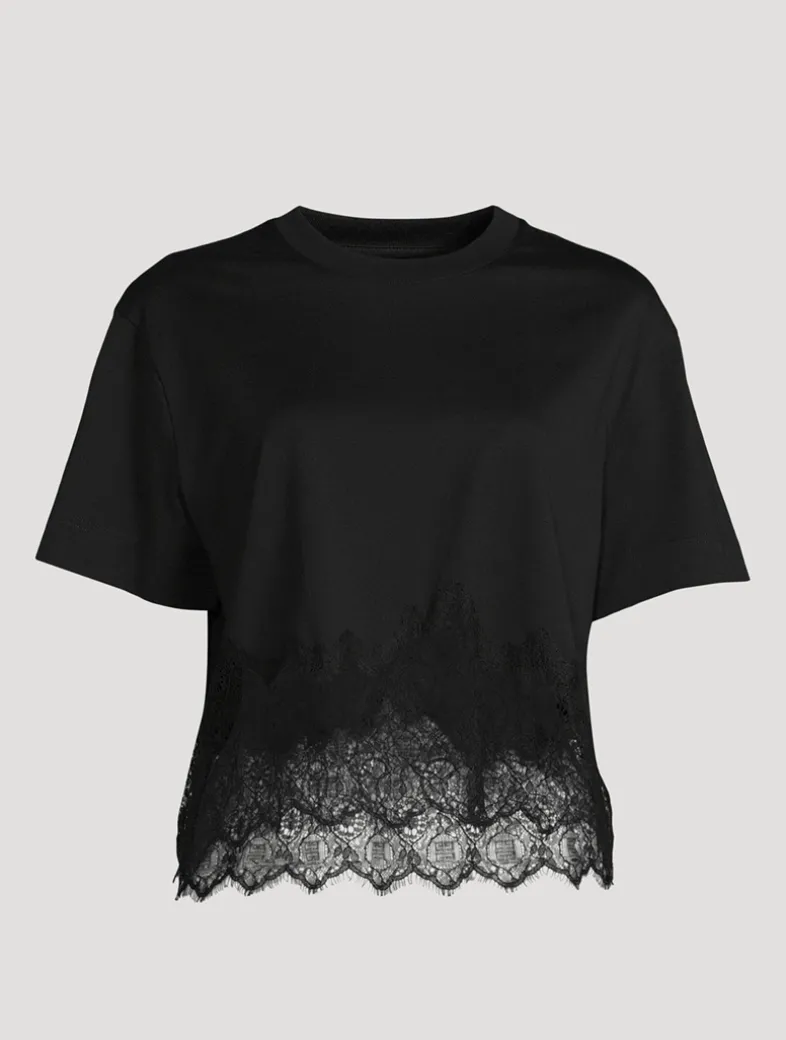 The classic look of this short-sleeve cotton tee is elevated with delicate floral lace trim with scallop detailing around its cropped hem.