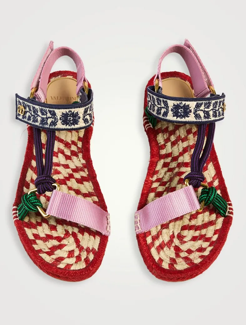 Nodding to sporty styles, these flat sandals are designed with embroidered cotton and webbing ribbon straps. They are set on a rope base with rubber sole.