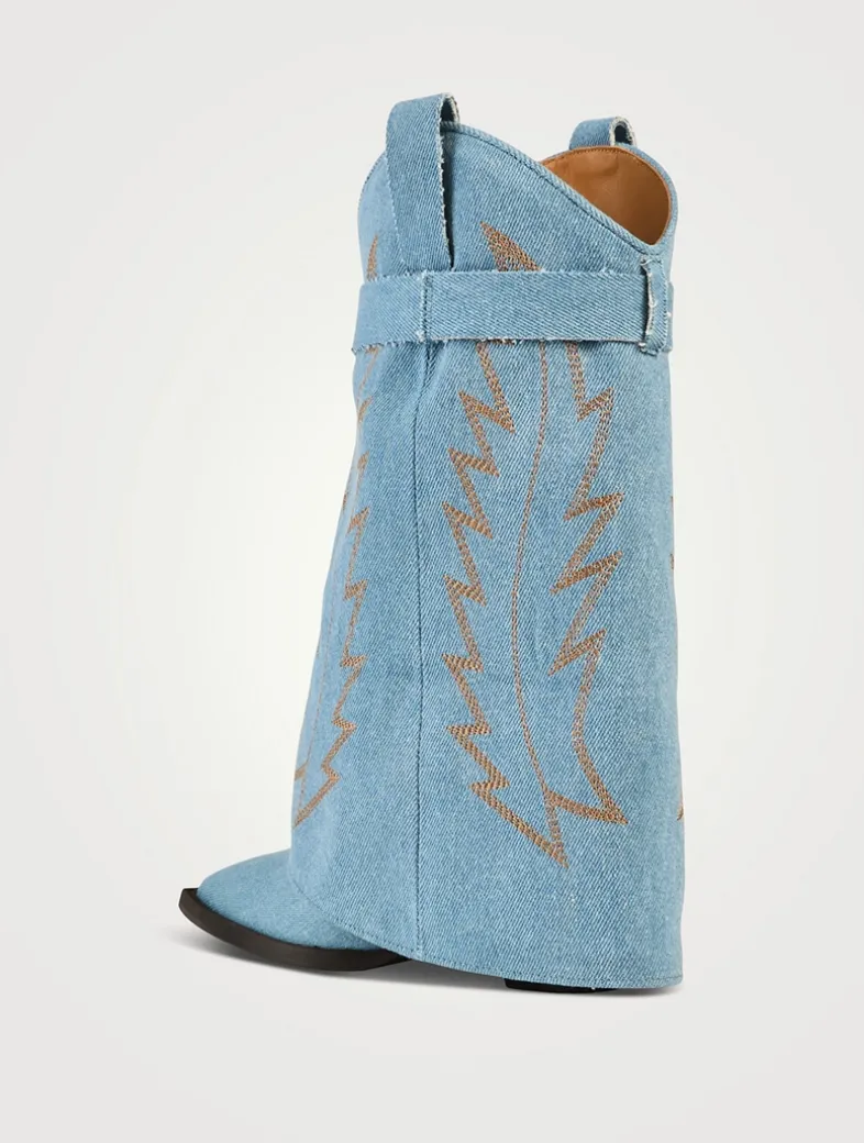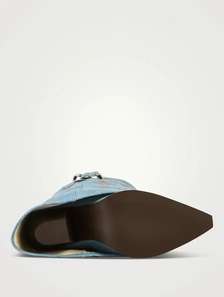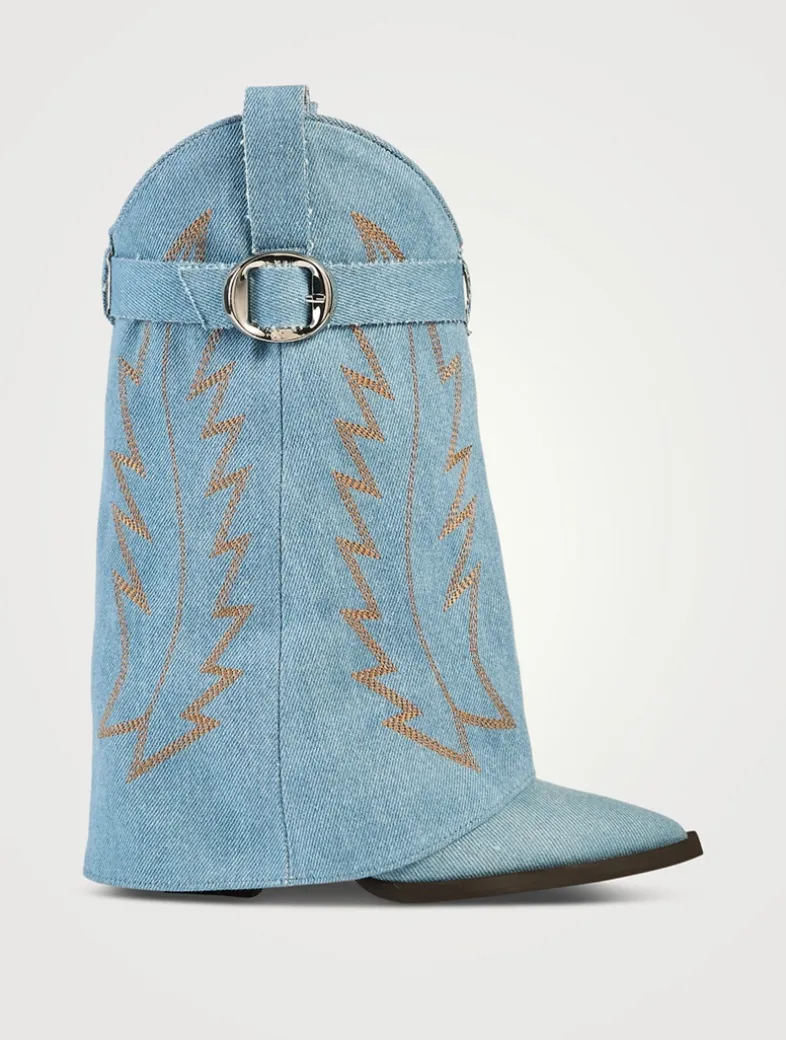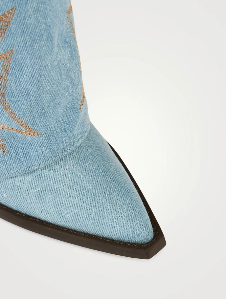 The Laredo boots redefine Western style with a contemporary twist. Crafted in light denim, they feature bold contrast stitching and a sleek pointed toe. With a high heel and modern silhouette, these boots are a statement piece perfect for adding a unique touch to your wardrobe.