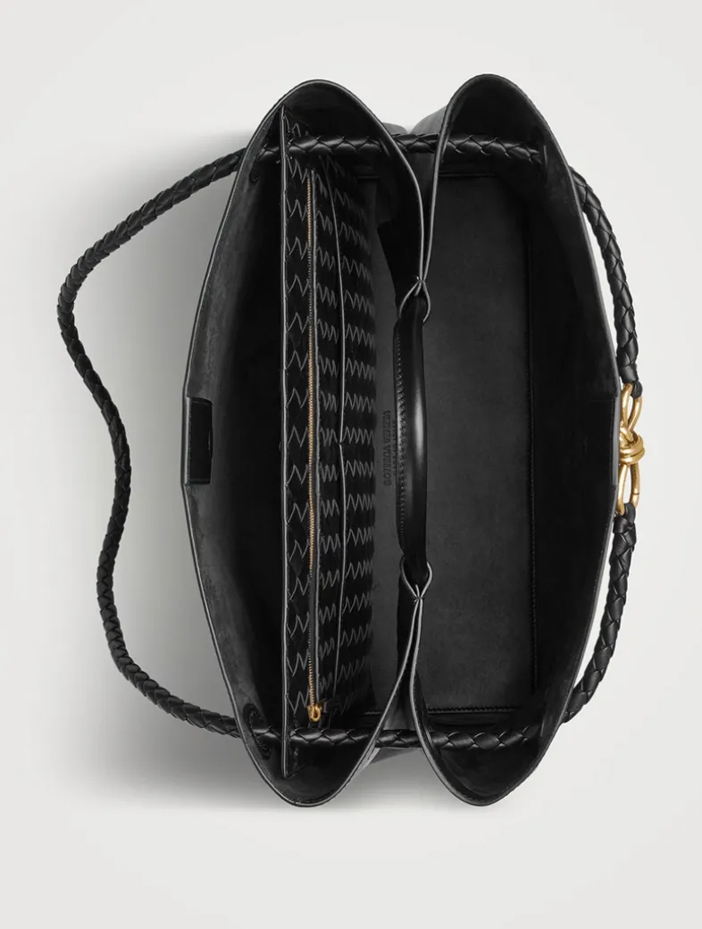 This top handle bag with a boxy silhouette is meticulously crafted from silky leather featuring an Intrecciato leather internal pocket and a sliding crossbody strap. Bottega’s signature knotted metal hardware completes the look.