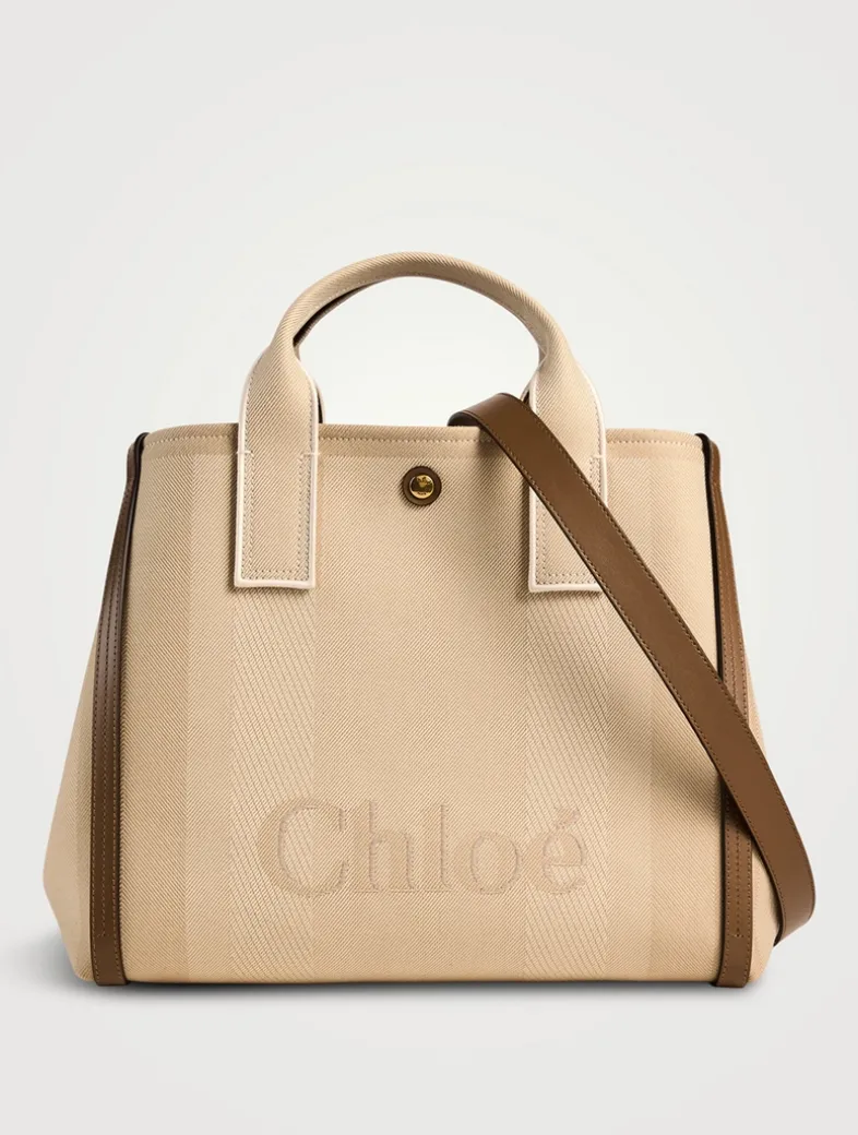 The Chloé Carry tote bag is crafted from striped cotton canvas jacquard, complemented by contrasting vertical leather bands and an oversized Chloé logo. This day bag has magnets at the sides, allowing the structured silhouette to be adjusted to a rounded, more compact shape. Carry with the double handles or the removable strap.