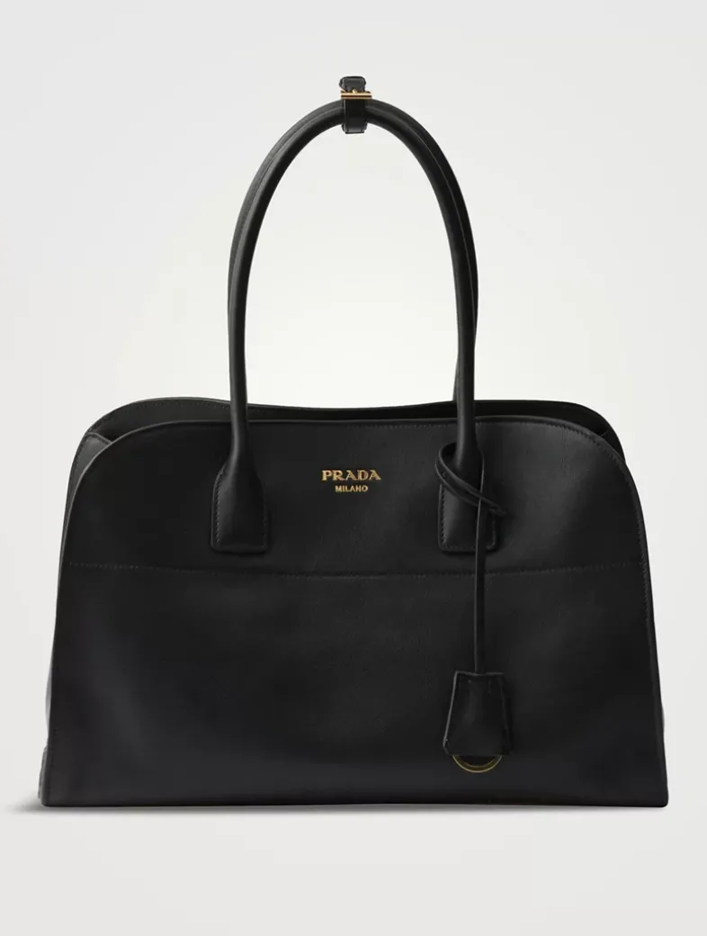 Leather handles, drop 18 Removable key ring Metal hardware Lettering logo embossed on the front Nappa leather interior with three pockets, including one with zipper With purse feet