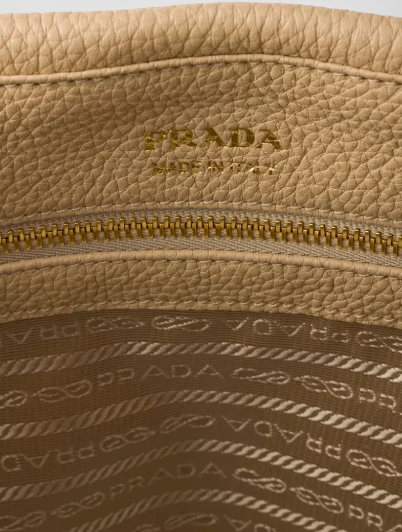 Leather handles Removable leather charm Metal hardware Metal lettering logo on the front Logo-print nylon lining with two zipper pocket