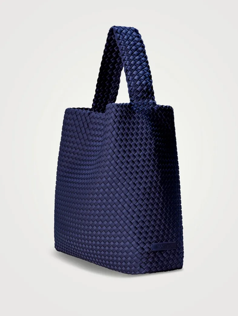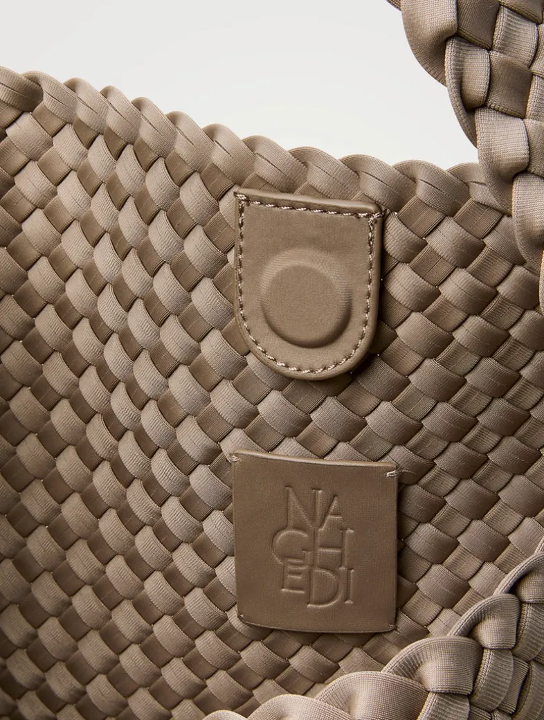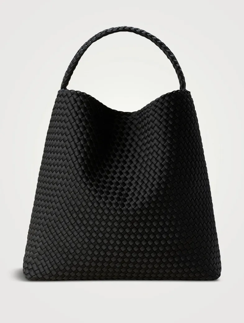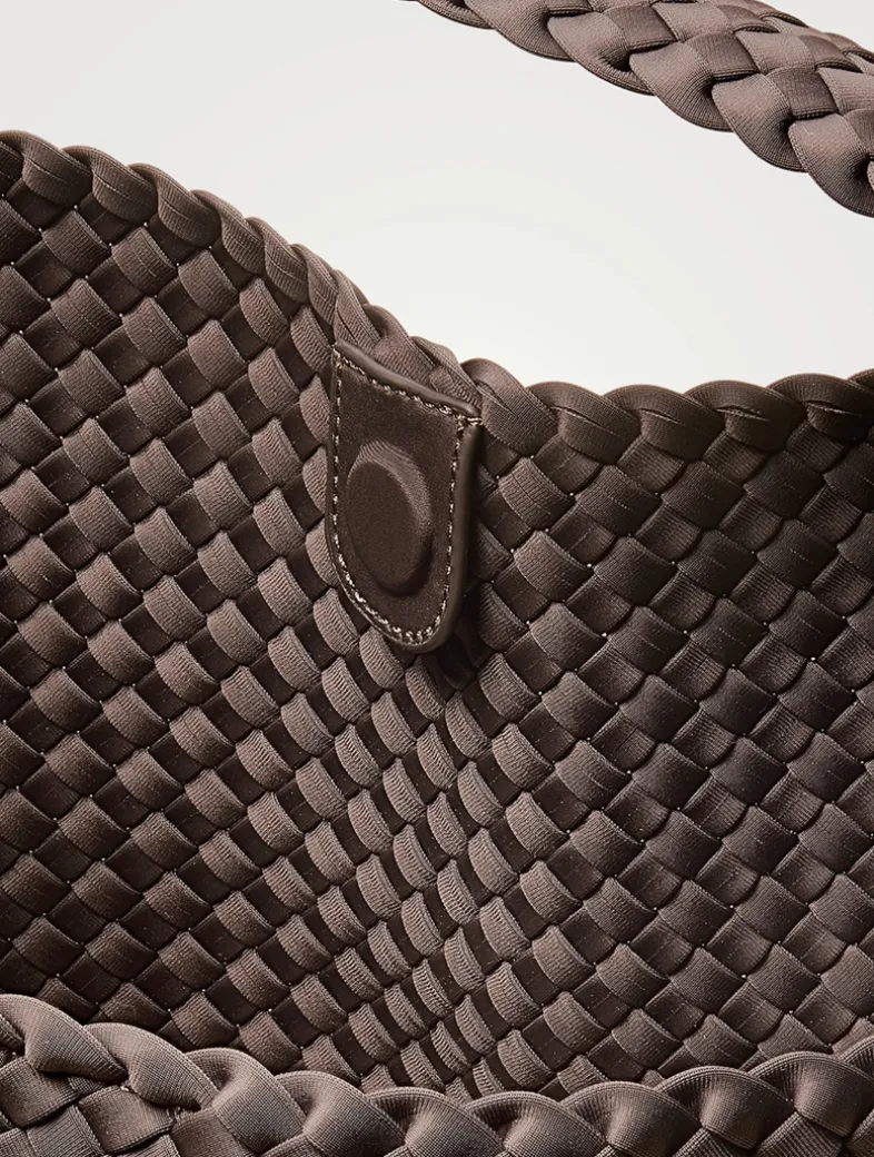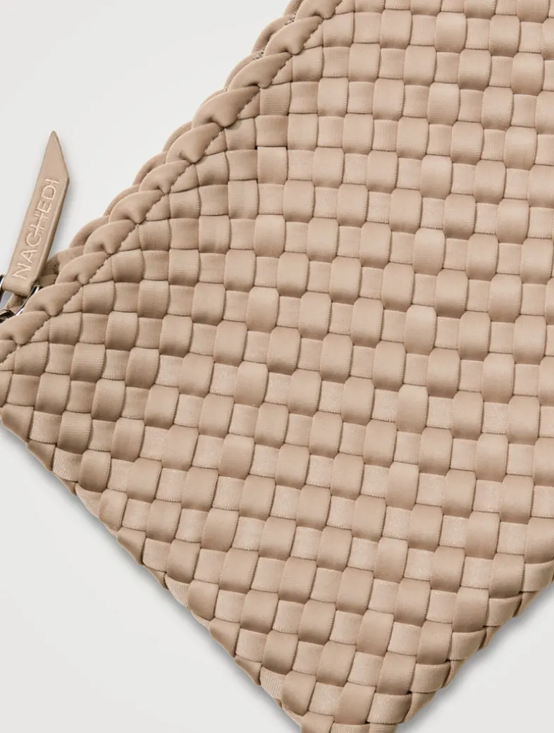 Handwoven from NAGHEDI’s signature neoprene, the Nomad is a modern take on a classic silhouette. It is extra spacious, with a wide strap that sits flat on the shoulder. The strap is intentionally designed slightly shorter; it will gently stretch to the perfect length with wear. Matching woven zippered pouch included.