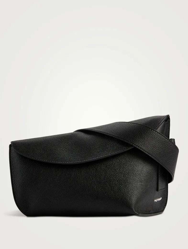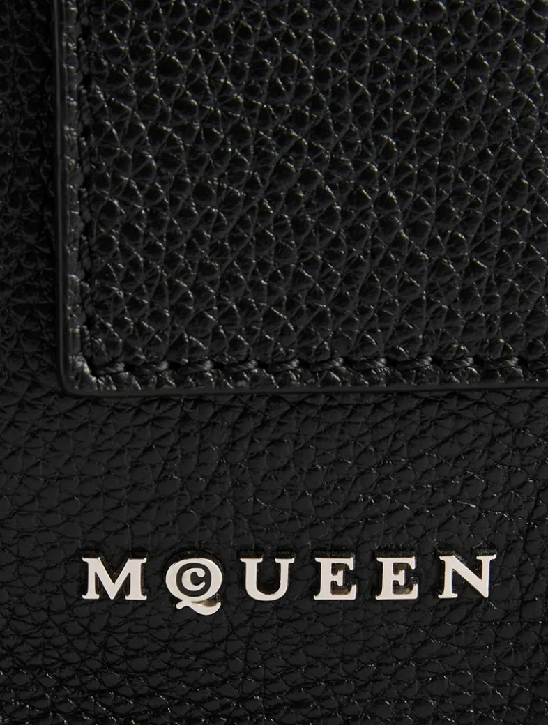 The T-Bar Sling bag is asymmetrical and handcrafted from a single piece of grainy calf leather with a side gusset for extra capacity. Can be worn crossbody using the adjustable leather strap. It is detailed with a statement T-Bar buckle engraved with the McQueen logo. Featuring one central zip compartment with card slot and metal D-ring.