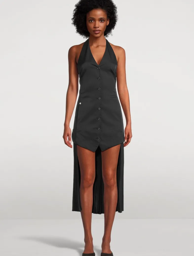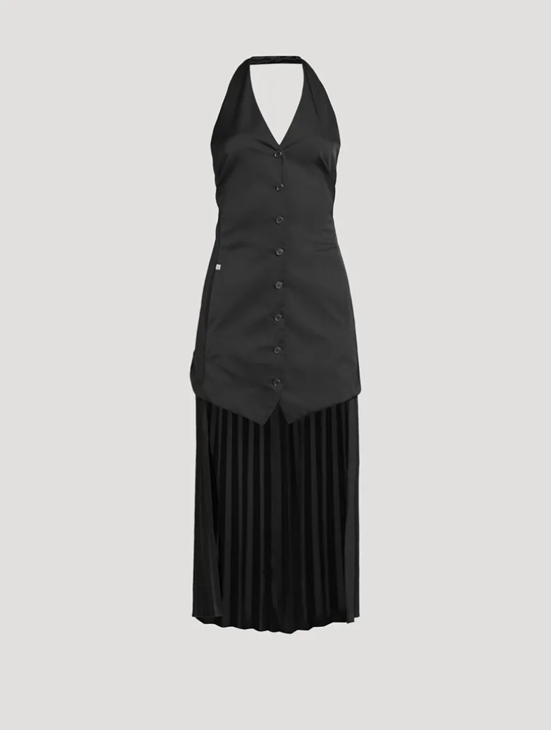 Topped with a flattering halter neckline, this fluid twill dress is designed with a full-length pleated skirt in back. Tie in the back for a wrapped effect, or in front for a layered look. It features buttons at the front, a hidden elastic waistband in back, and in-seam side pockets with metal logo clip.