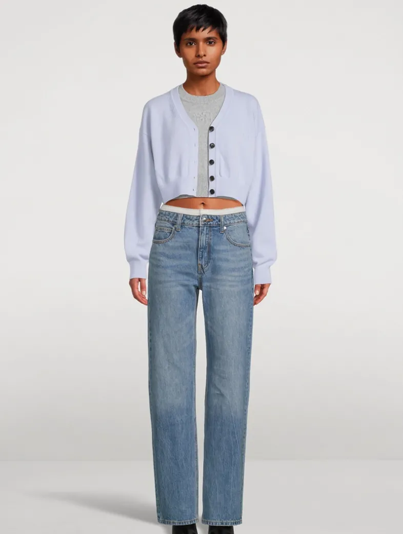 These rigid denim jeans, with a pre-styled pointelle waistband, illustrates a brand-signature aesthetic. They have a relaxed top block with a straight, wide leg designed to stack on the wearer. Finished with classic five-pocket detailing and zipper fly closure.