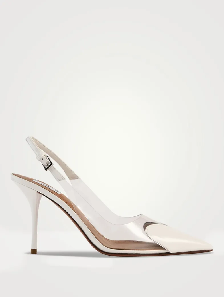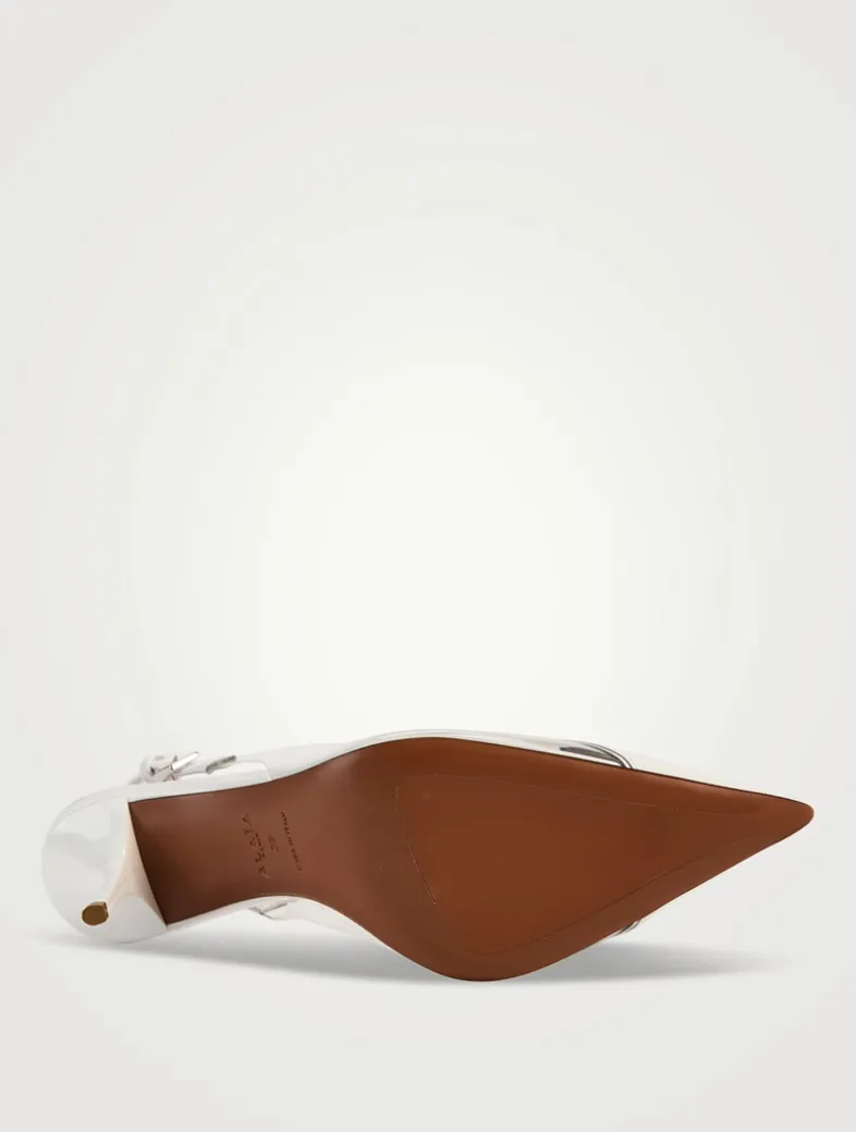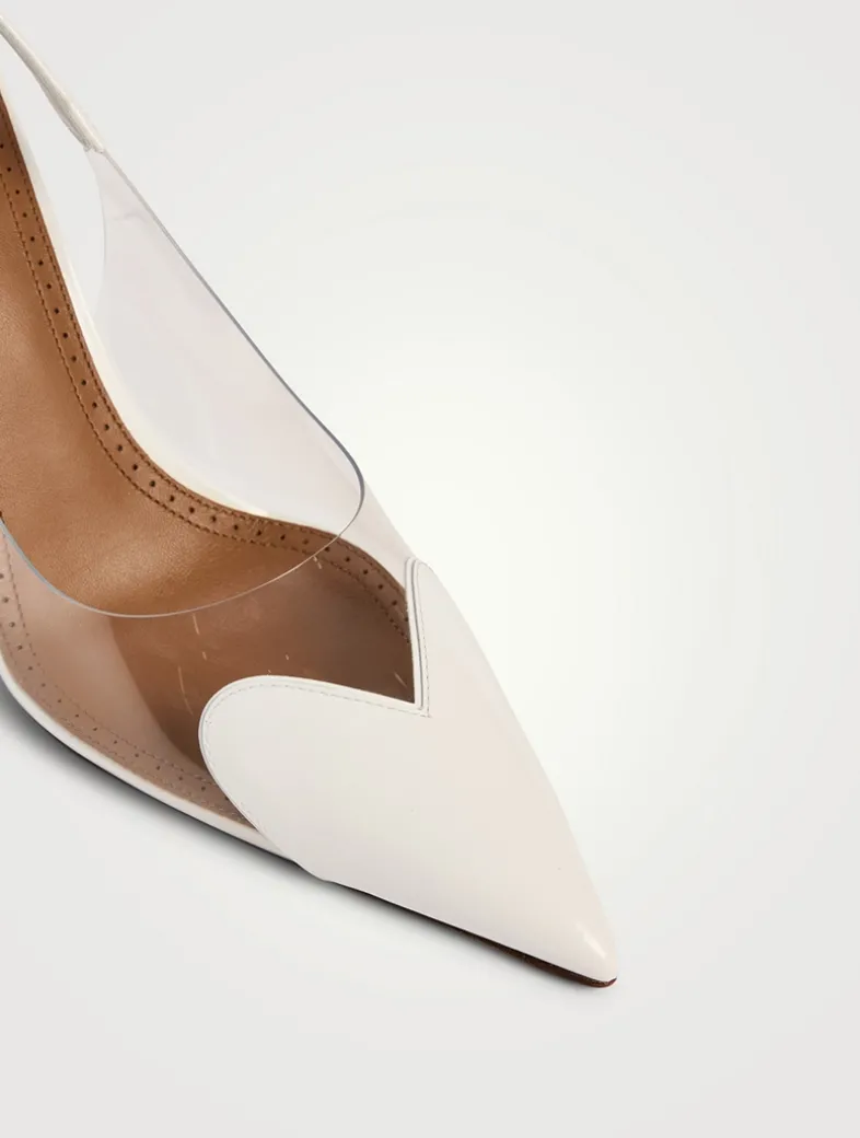 These pumps are detailed with a patent leather heart at the vamp, highlighting the point-toe design of this pair. Set on a covered leather heel, they are finished with an adjustable slingback strap.