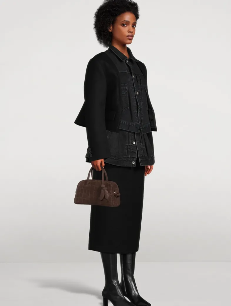 A softly structured bowler silhouette is rendered in embossed suede embellished with bow detail. It can be carried by hand or worn on the shoulder with an adjustable and removable strap. Finished with a single pocket inside.
