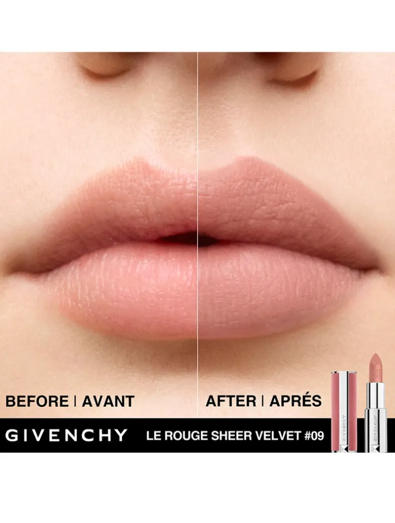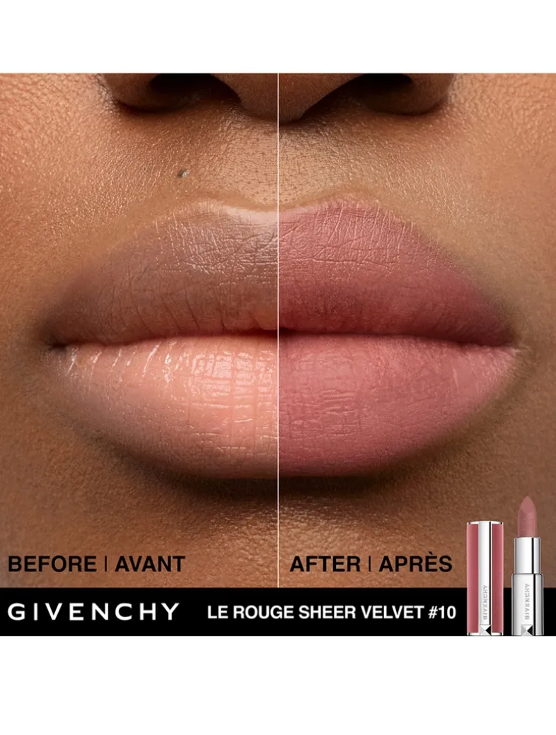 This Le Rouge Sheer Velvet lipstick embodies the unparalleled modernity and elegance of the Givenchy Maison. Vibrant colour meets a sheer matte finish, infusing the lips with a long-wear blurring effect that can be built up as desired. Housed in a suitably sumptuous pink velvet case—complete with an easy <a href=