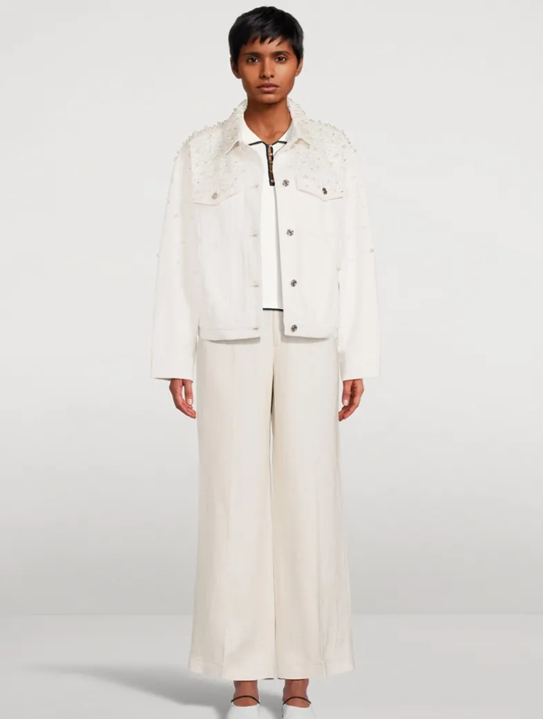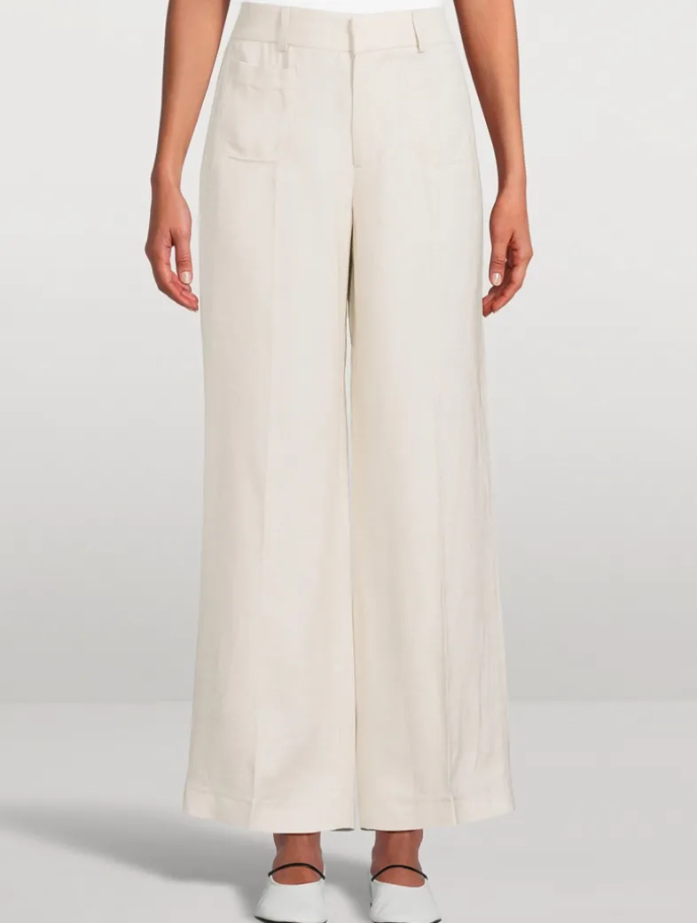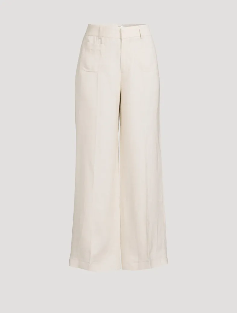 FRAME’s best-selling palazzo silhouette, now with chic front pocket details. Crafted from in an airy linen blend, this pair has a flattering high rise, fitted hip, and subtle wide-leg flare that hits at the floor.