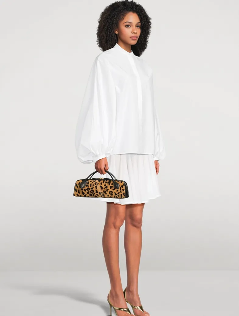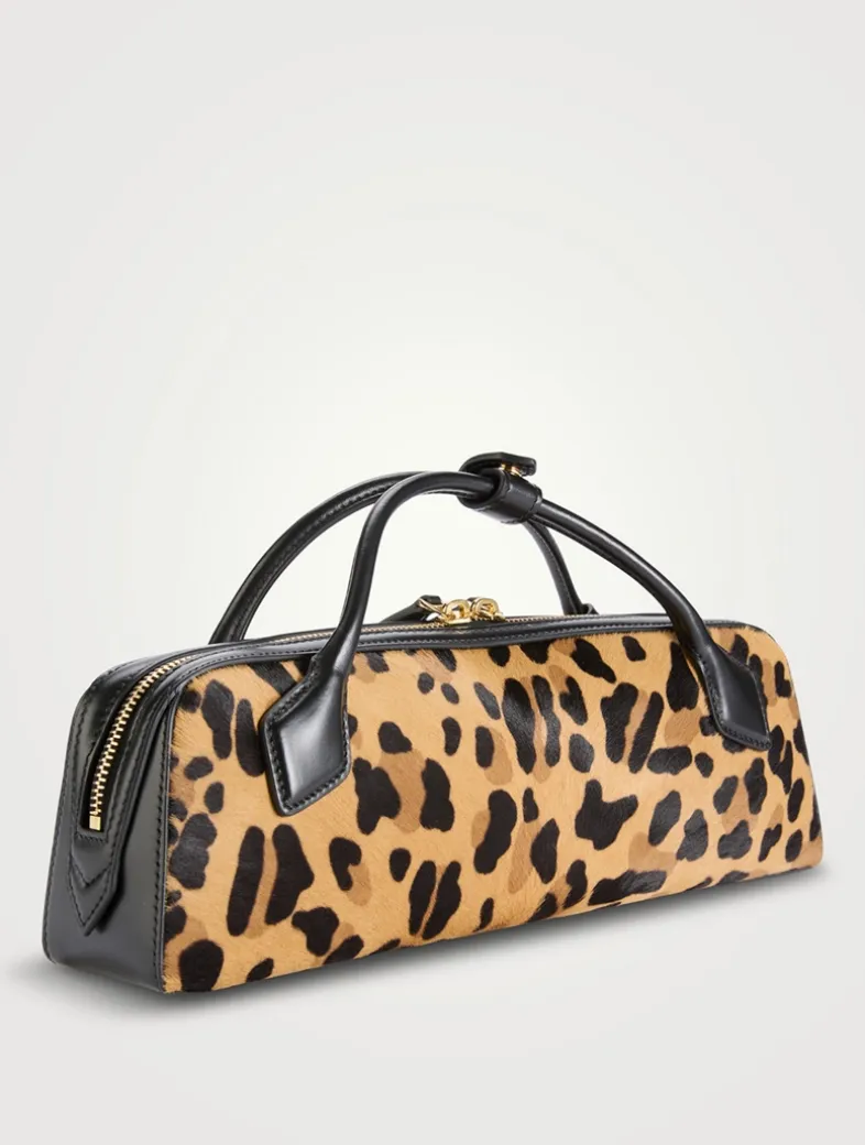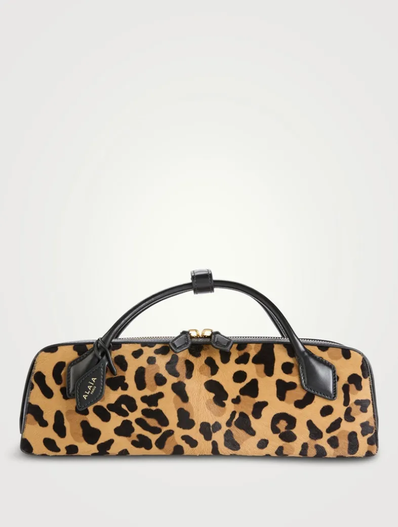 Designed with an elongated shape, this leopard-print calf hair bag is topped with a set of tubular handles with two decorative ties. It has a double zip fastening and a small removable mirror in the inside pocket.